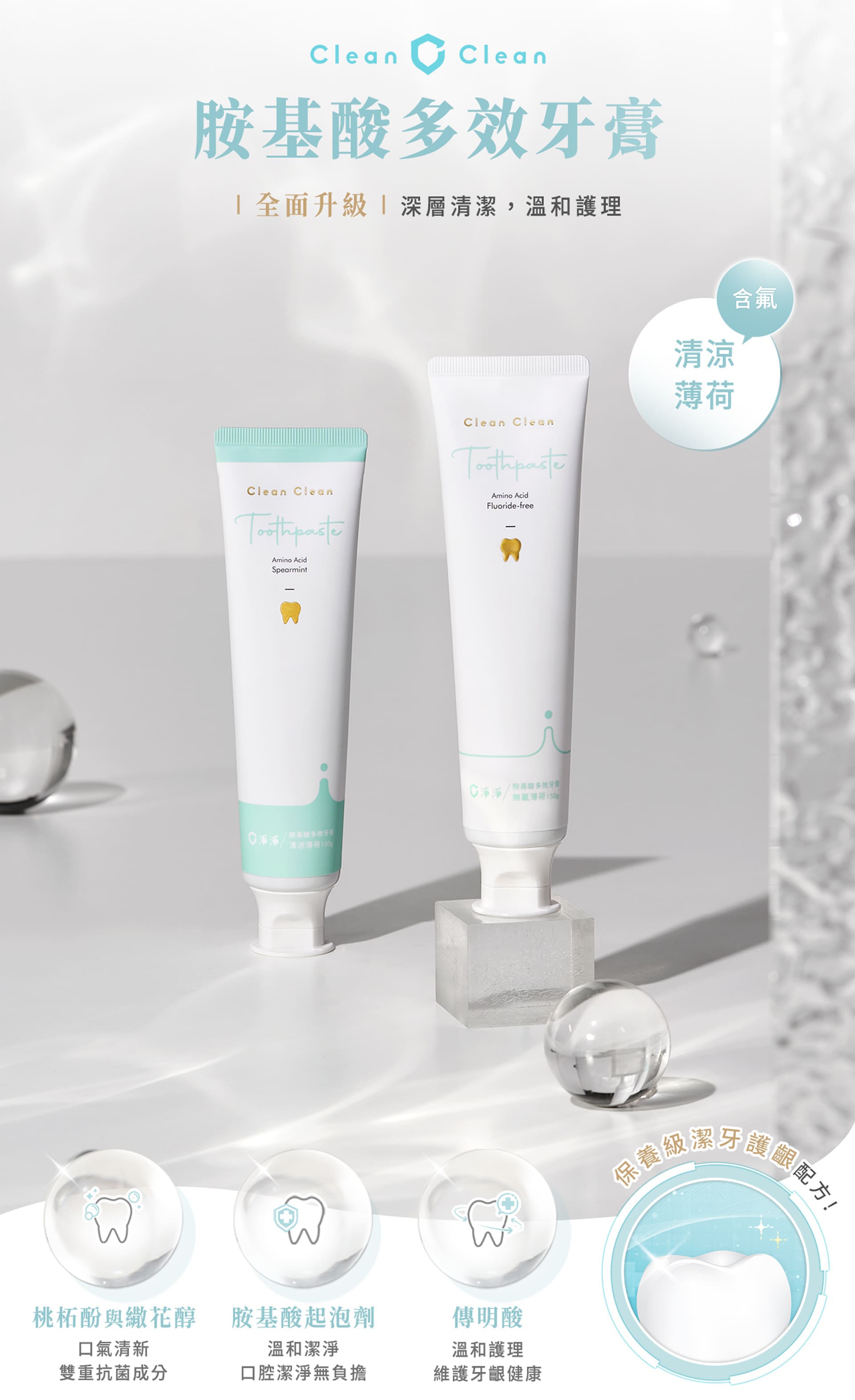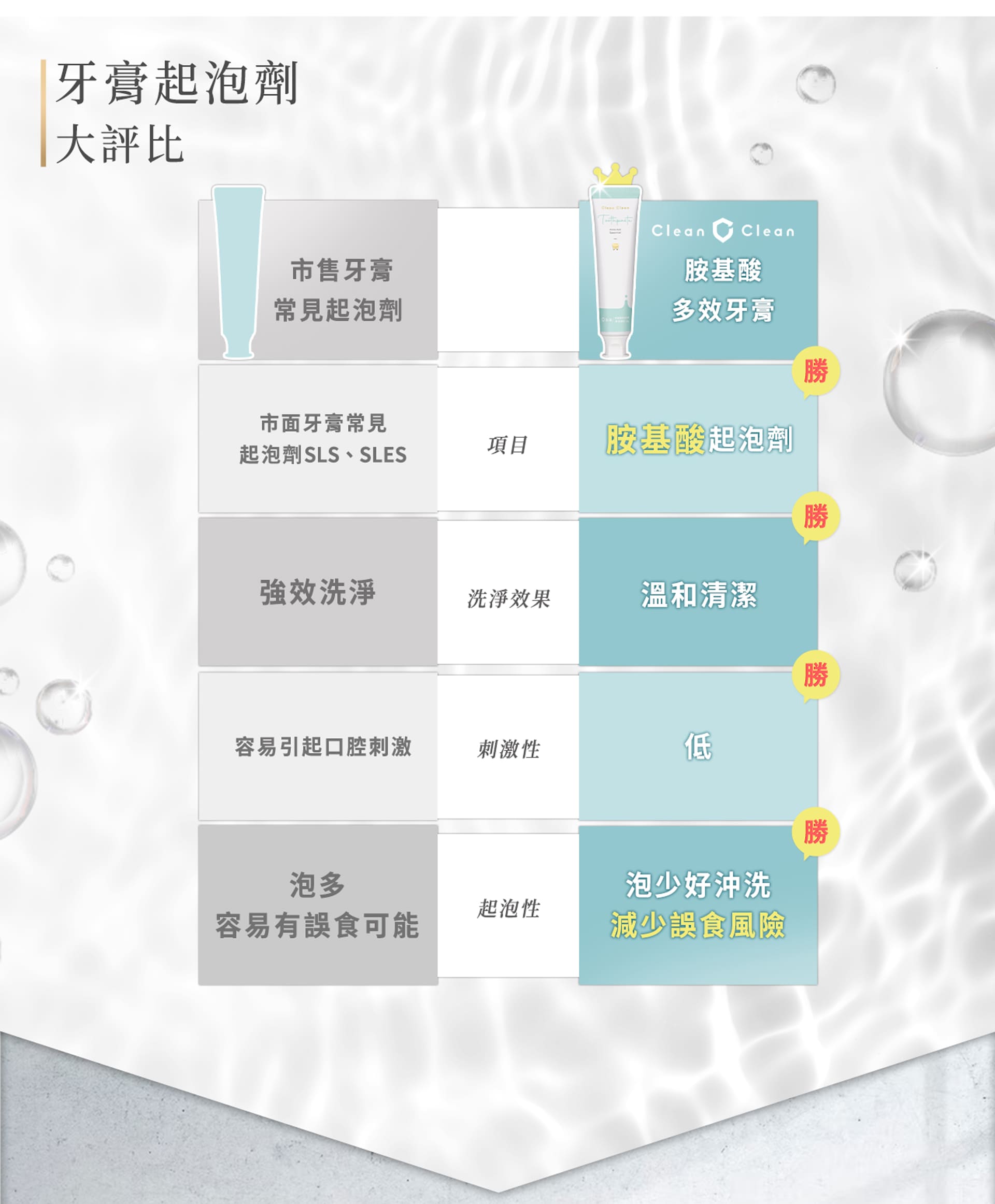 - 胺基酸起泡劑:低泡好沖洗、減少口腔摩擦