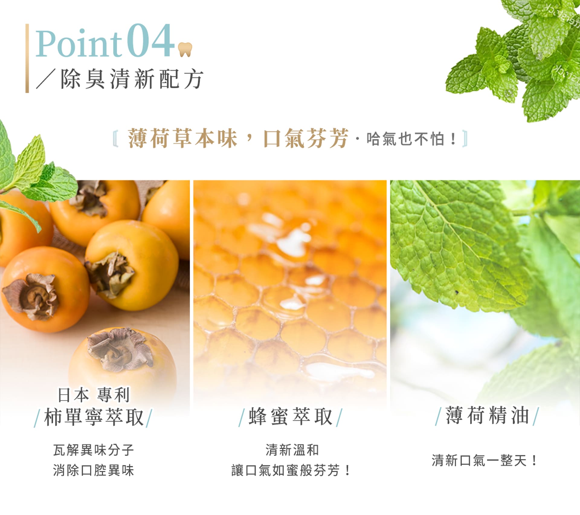- 清新除臭配方:柿單寧+蜂蜜+薄荷精油、維持好口氣、哈氣也不怕