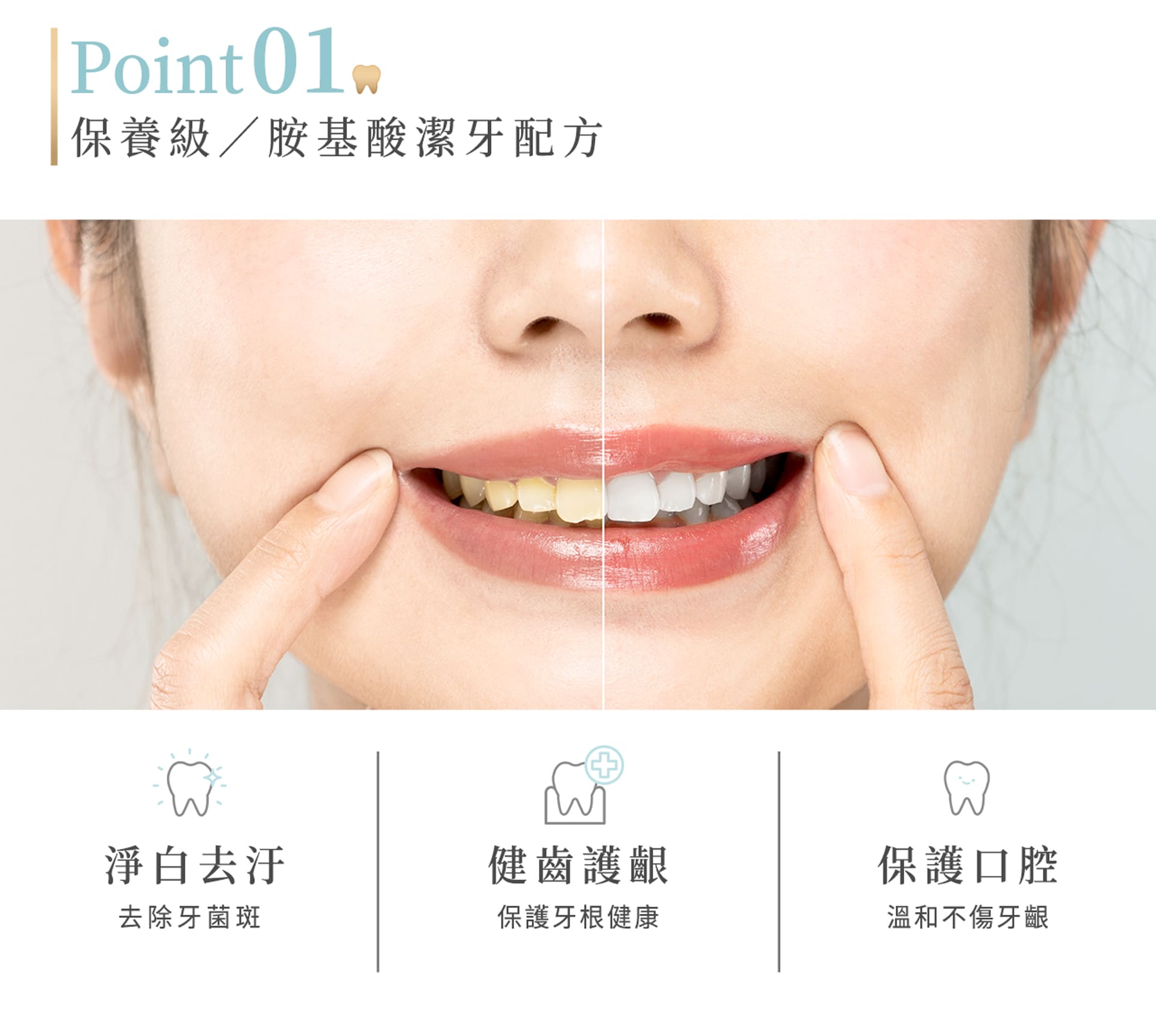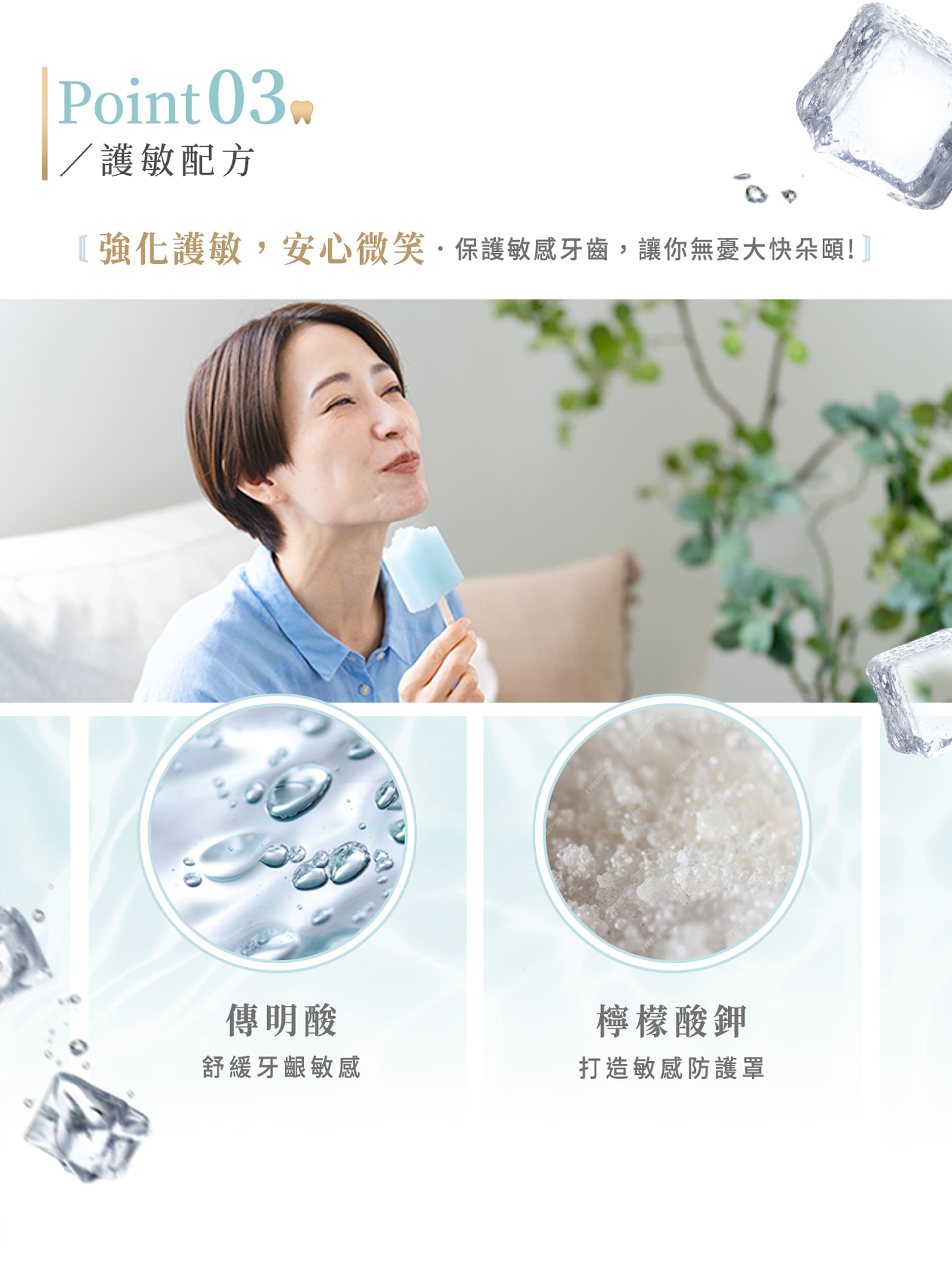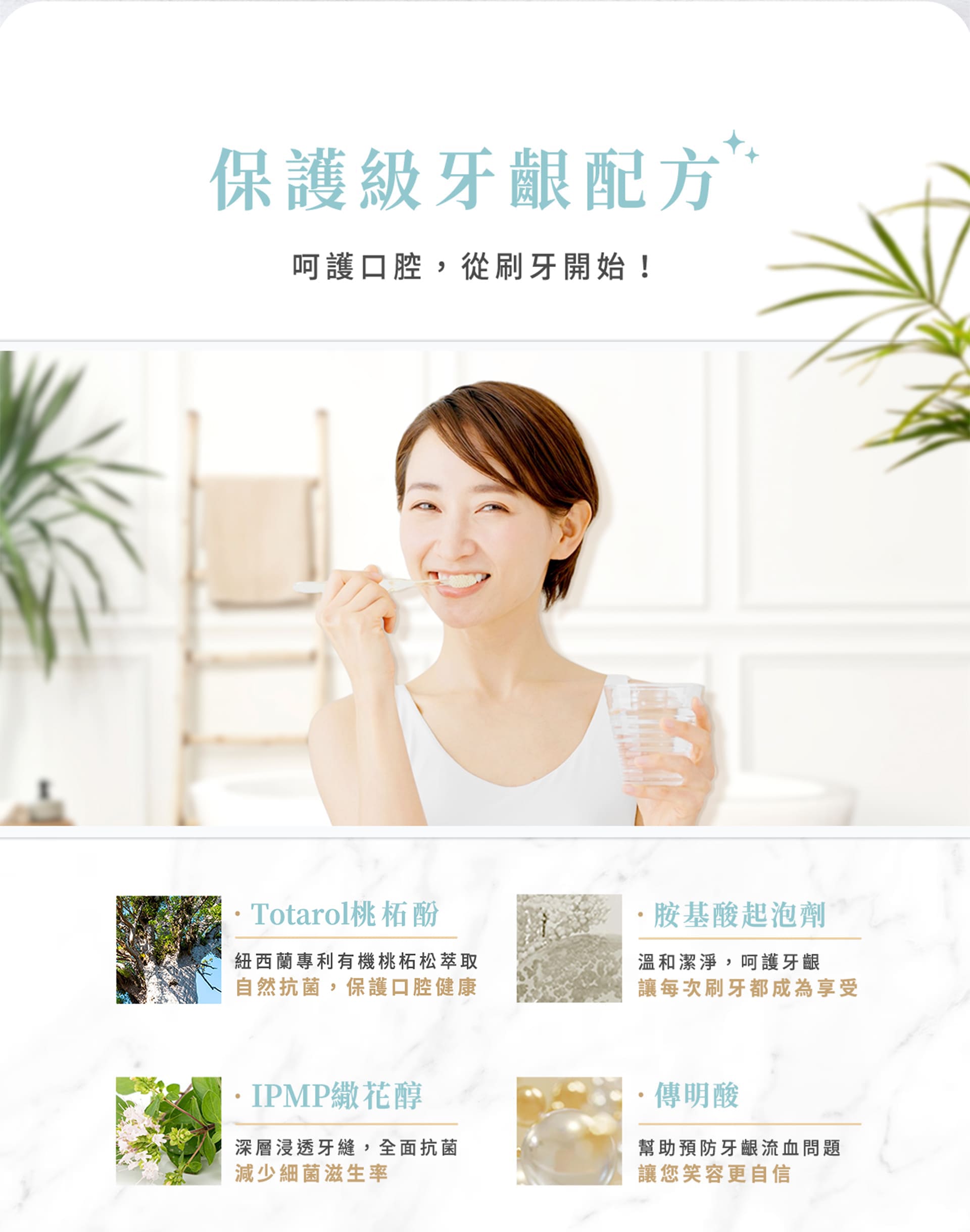 - 保養級護齦抗敏配方:傳明酸+檸檬酸鉀、減少牙齦出血問題