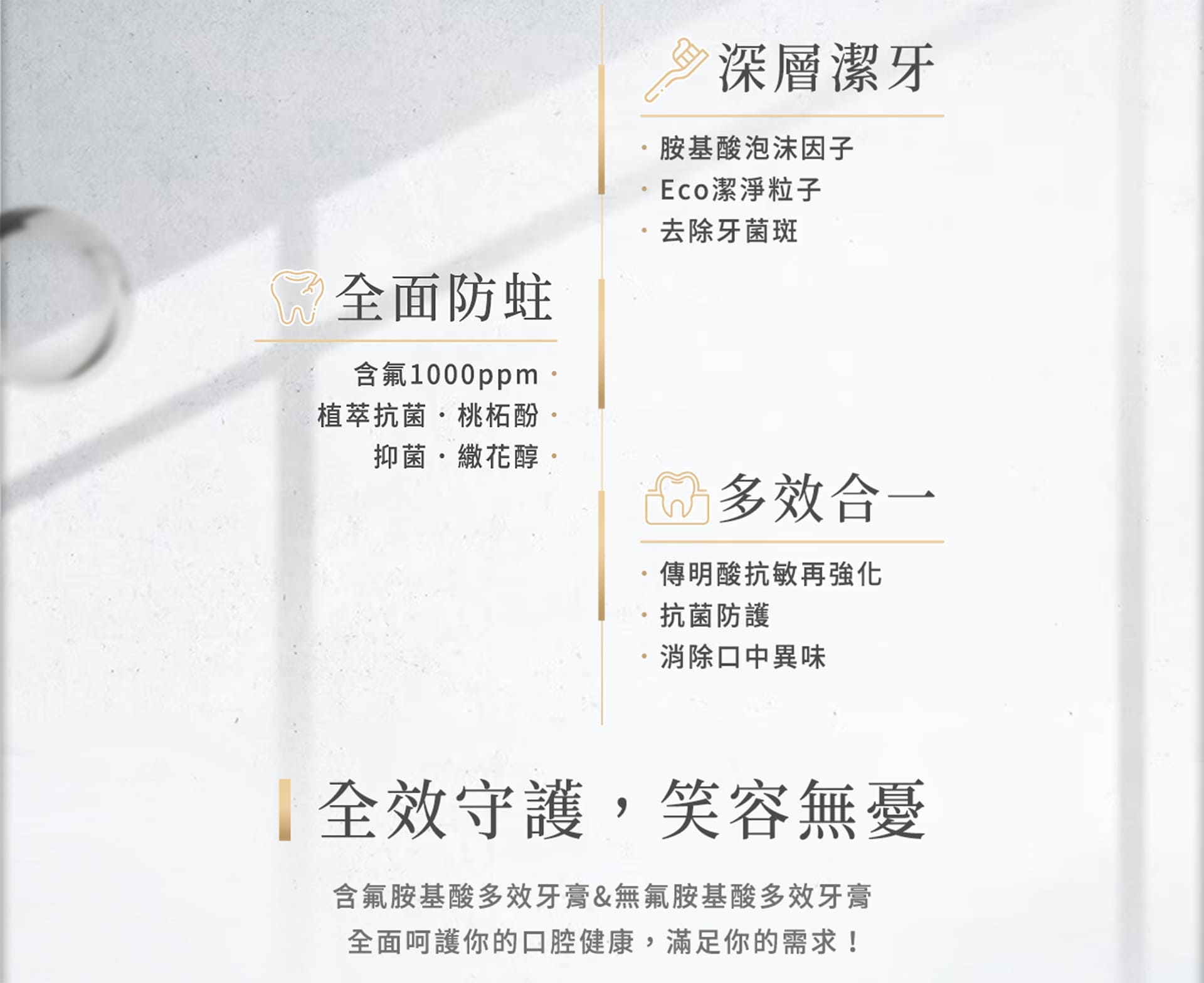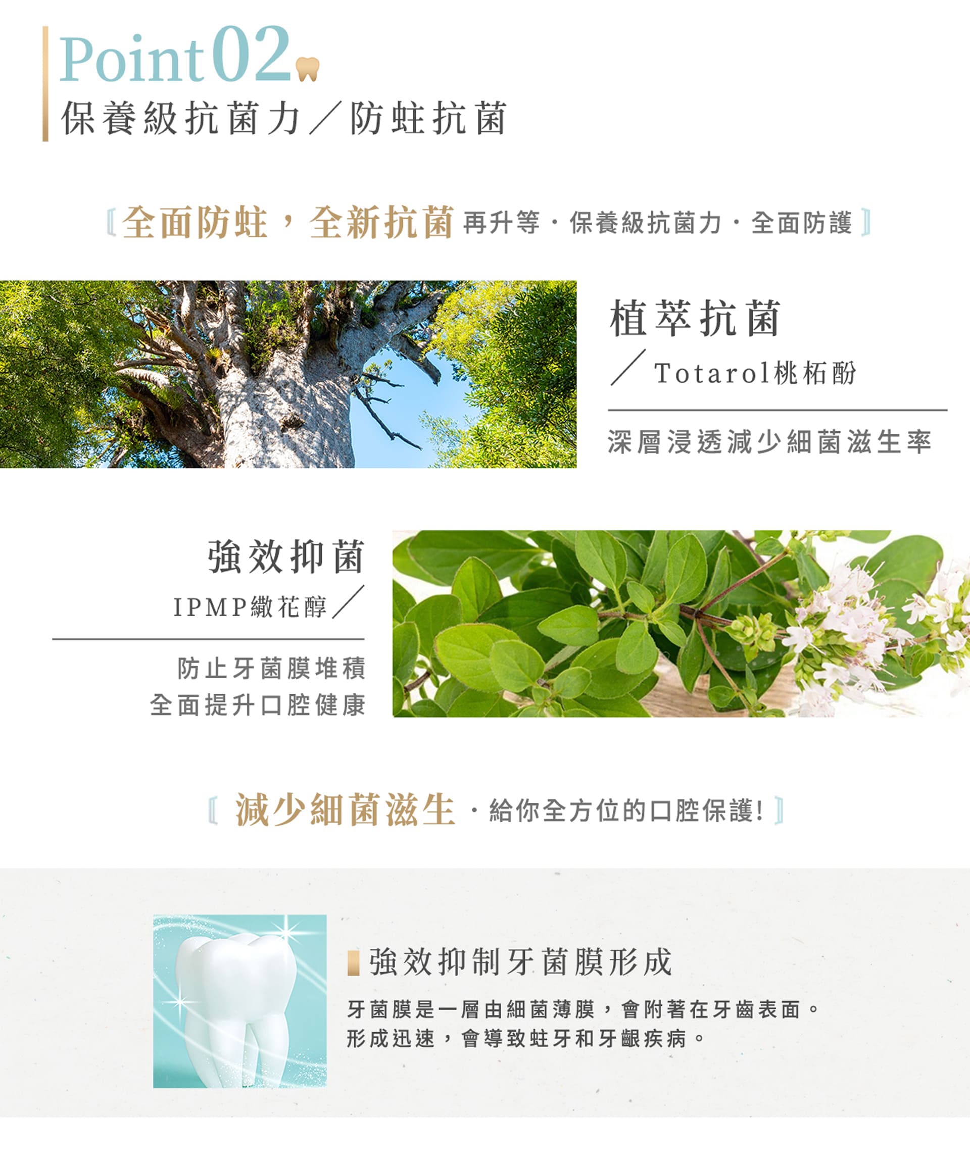 - 全面防蛀再升級:桃拓酚+繖花醇、減少細菌、牙菌膜滋生
