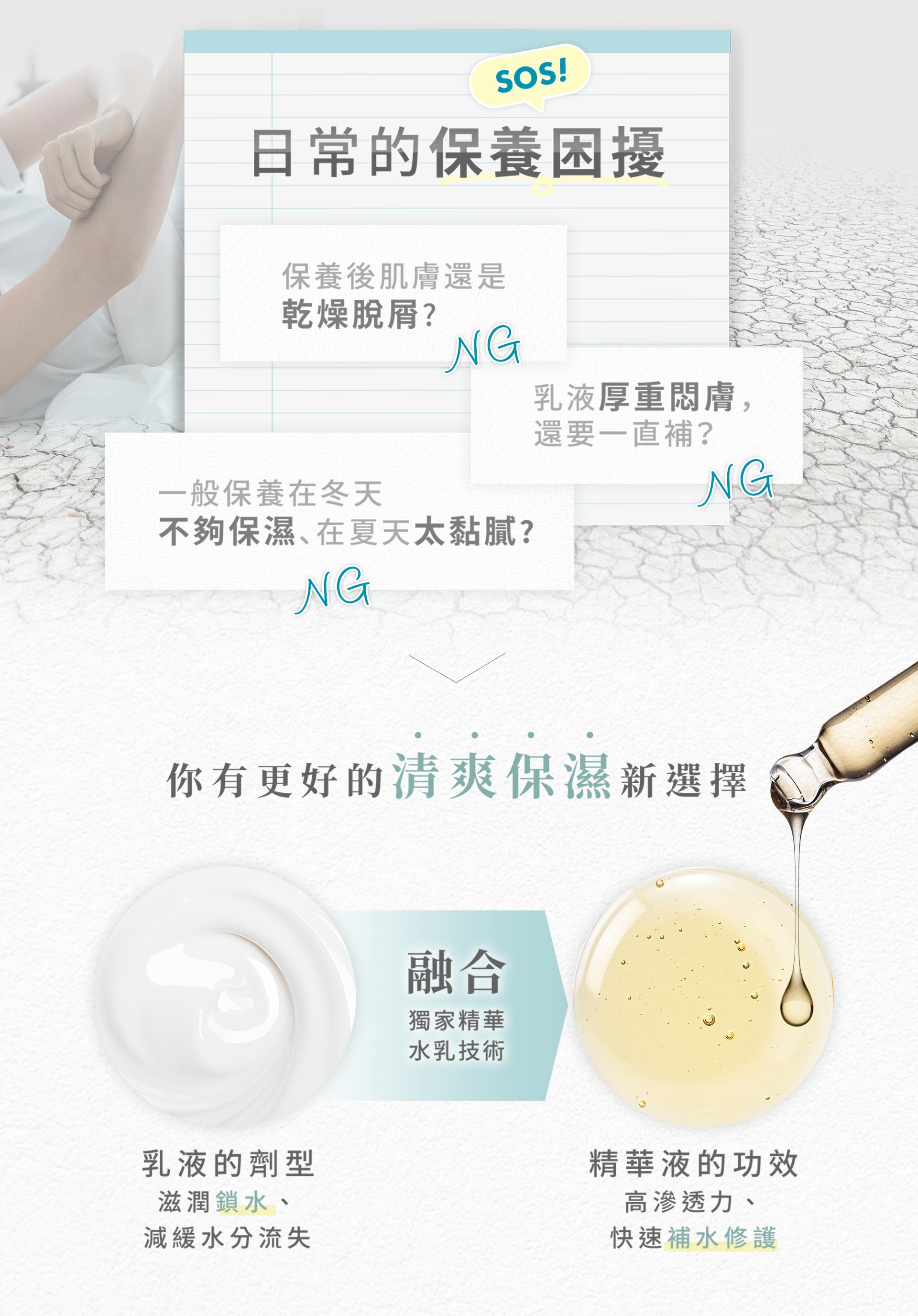 - 搞定乾燥、粗糙、敏弱,讓肌膚「喝飽水、鎖得住、修得好」
