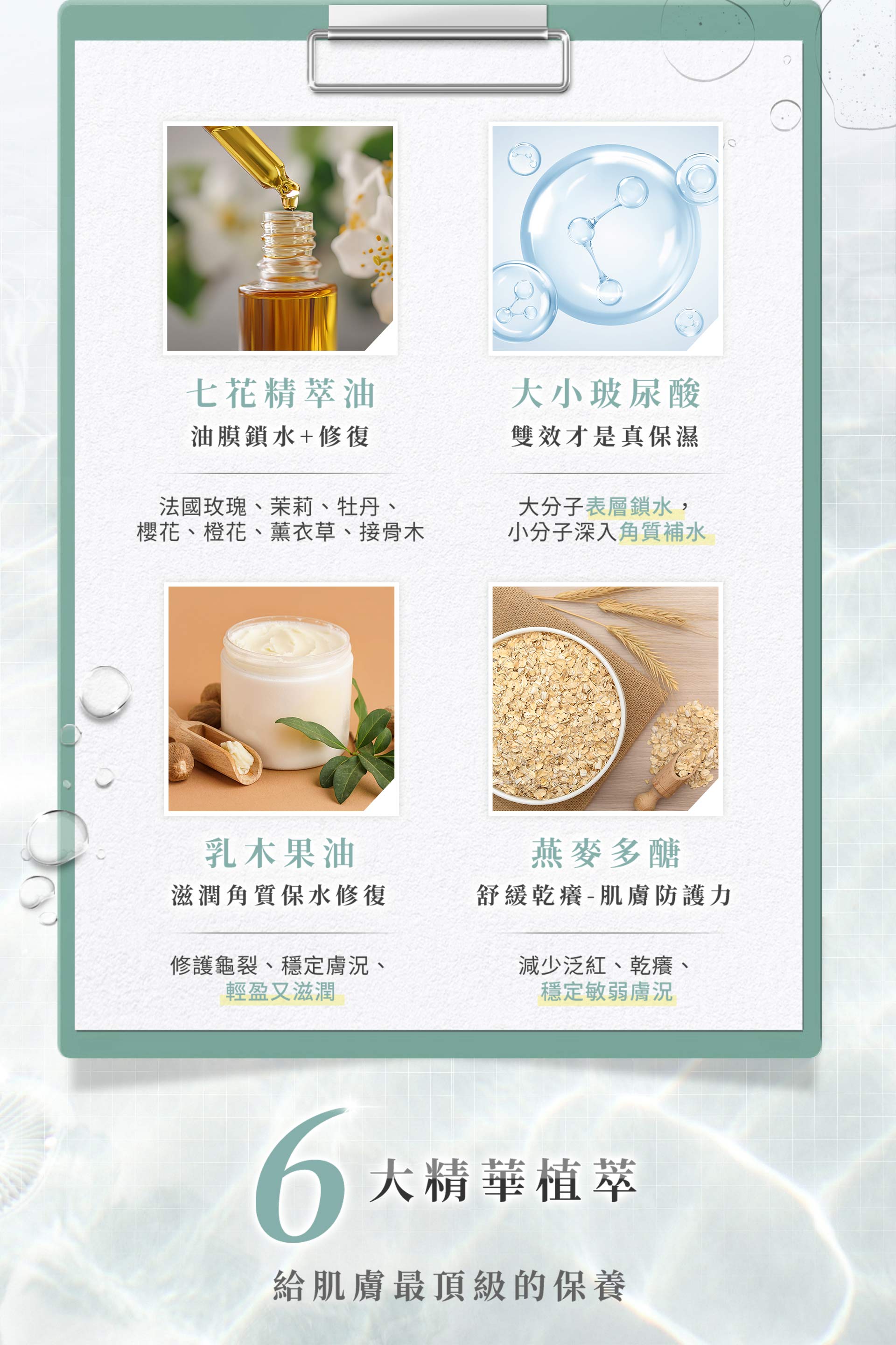 - 七花精粹油:嚴選七種花卉植物油,保濕舒緩,穩定膚況