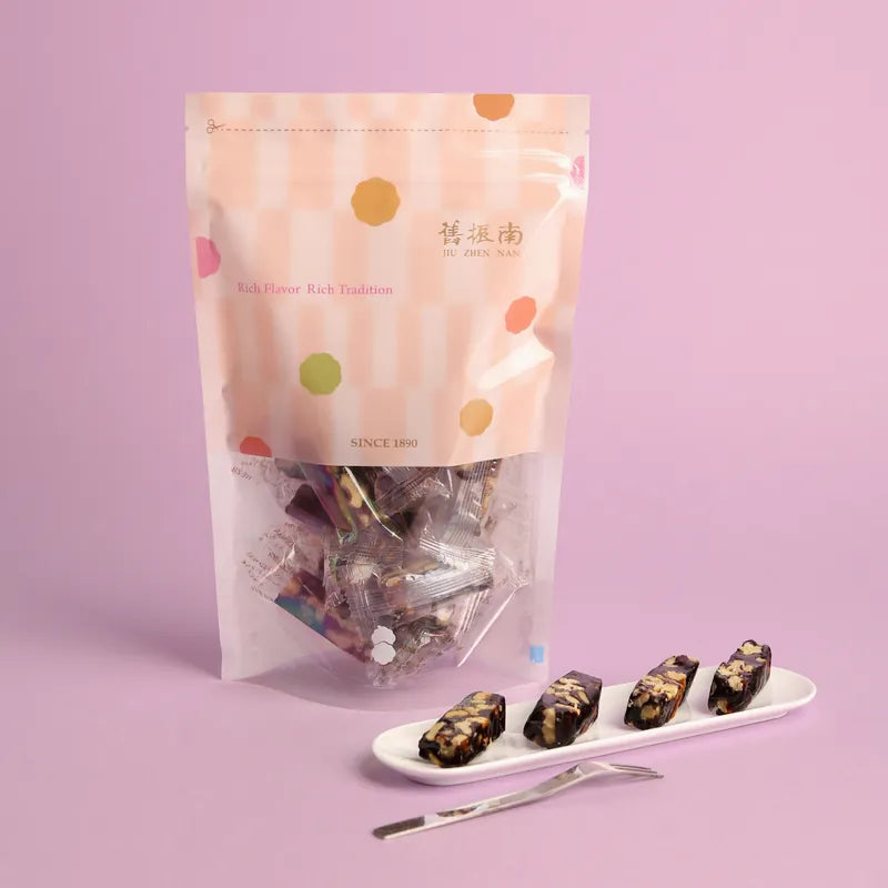 棗泥核桃糕的製作極費功夫,從煮糖水、製作黑棗泥、按比例拌入麥芽糖,再將核桃果仁烤至香酥後灑入,每個過程都是長年經驗的累積,才能製做出甜而不膩,香氣四溢又不黏牙、口感絕美的棗泥核桃糕,是舊振南長年熱銷的零嘴單品。