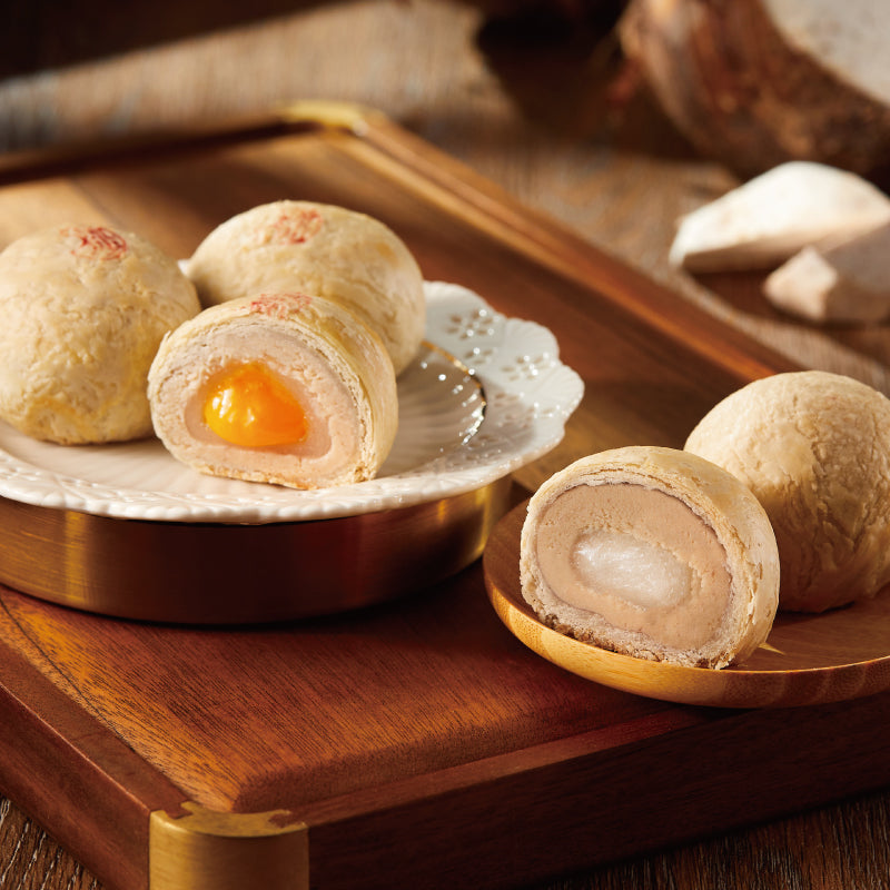 芋頭內餡香氣溫和,外型則烤成膨脹圓滿的球體狀,細心烘烤下的餅皮與皮酥層次分明,口感更顯鮮明豐富,由外而內帶給您酥、鬆、Q多重享受!