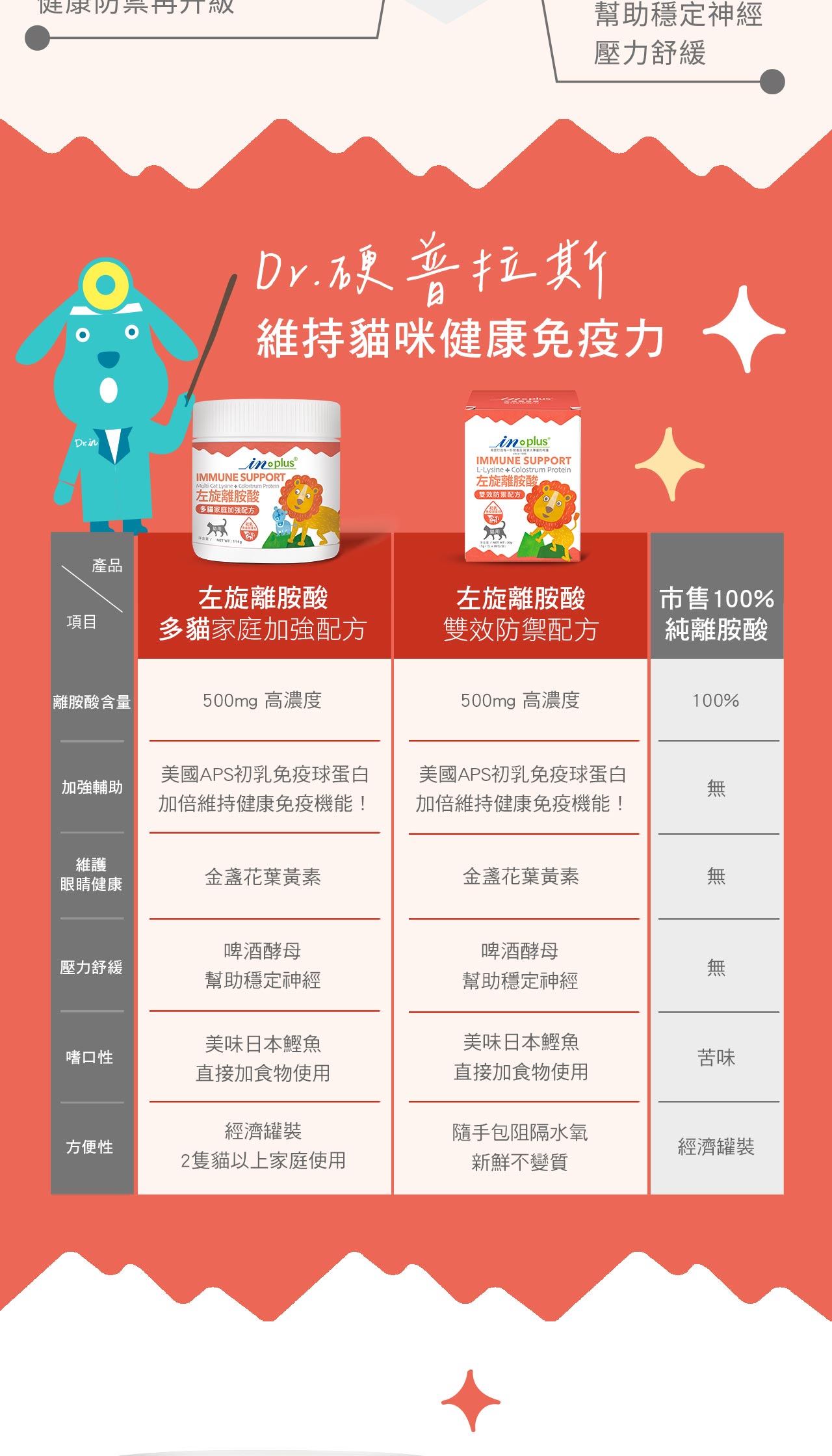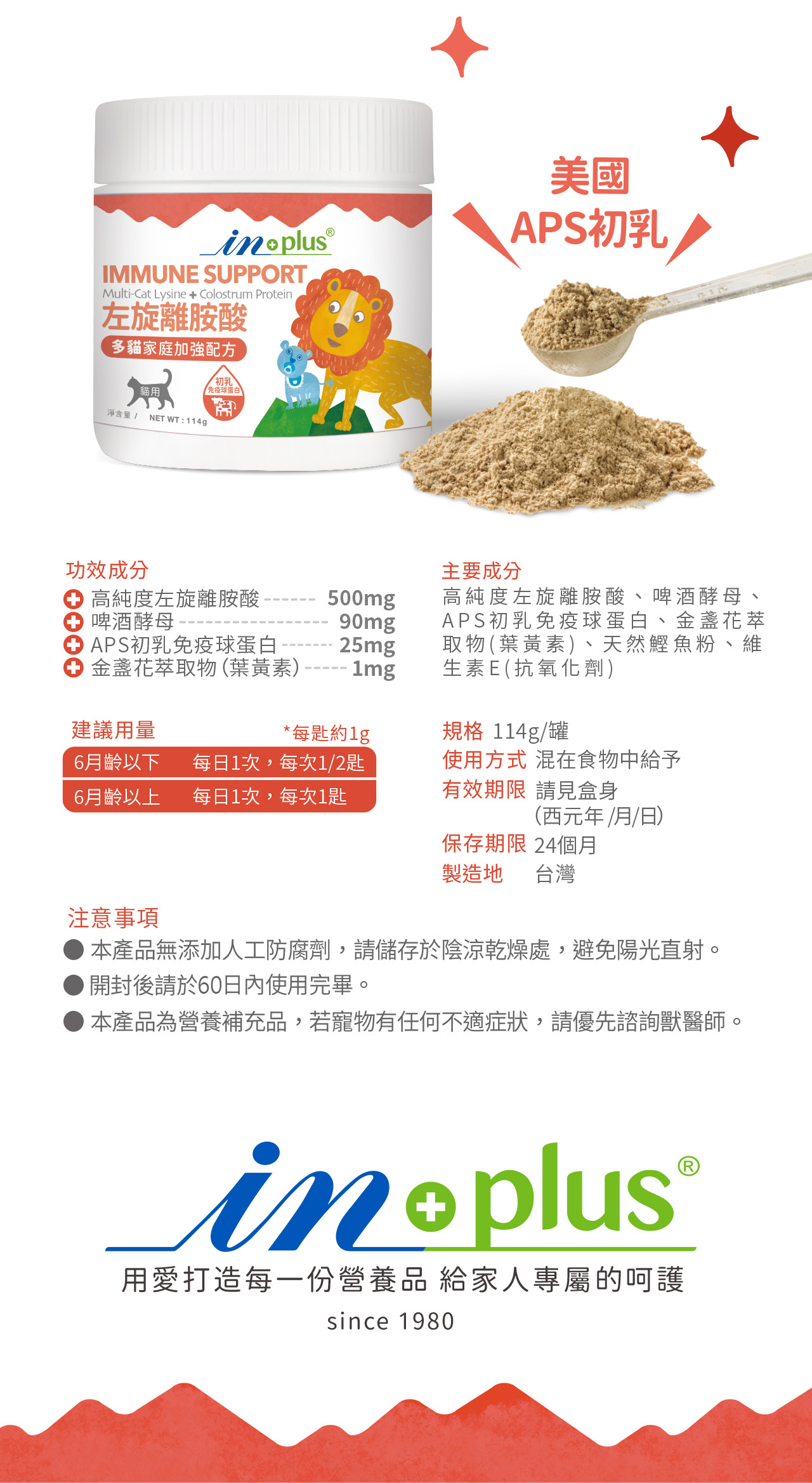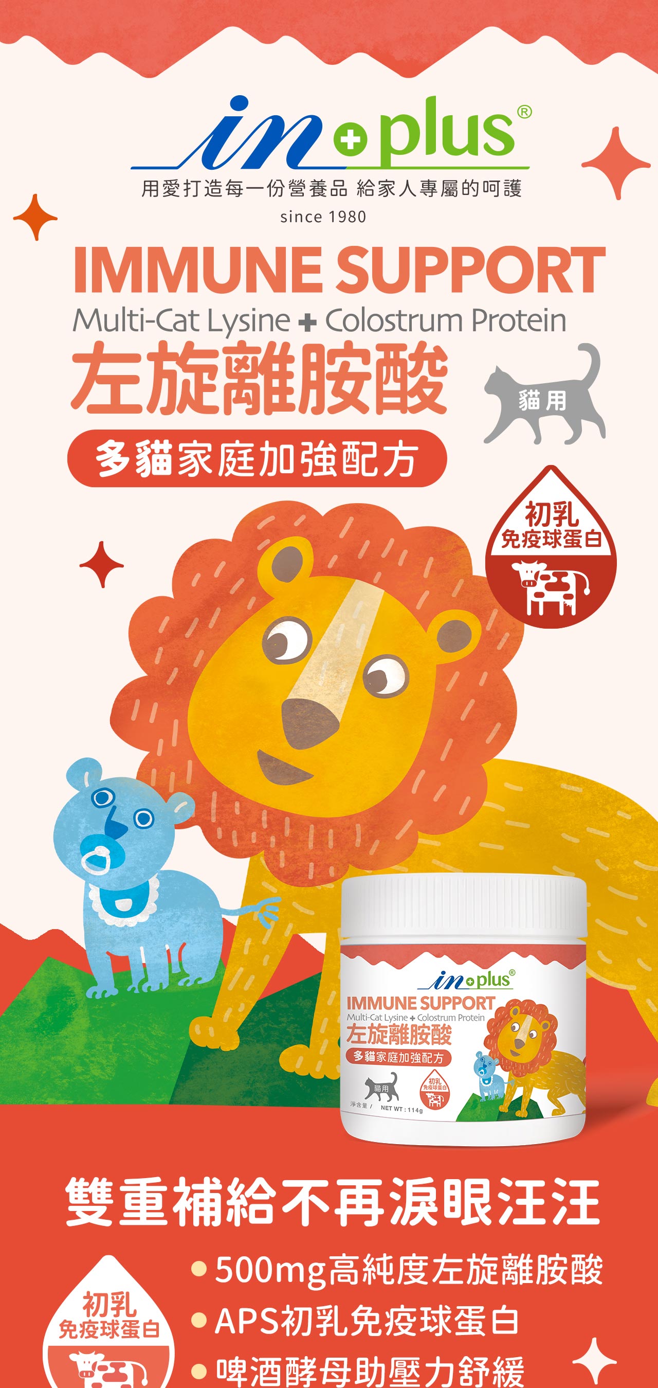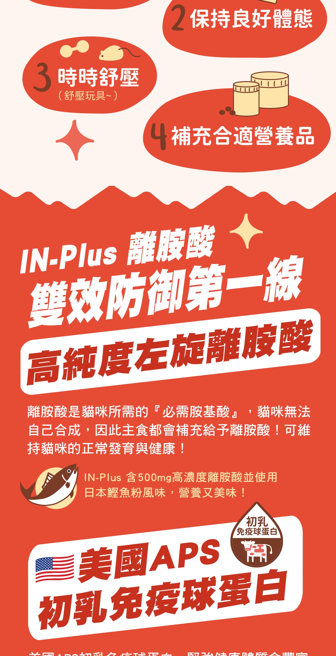 IN-Plus 左旋離胺酸雙效防禦配方,添加高純度左旋離胺酸及初乳免疫球蛋白,給貓咪雙重補給不再淚眼汪汪。另補充金盞花葉黃素,幫助貓咪維持明亮雙眼;啤酒酵母有助穩定神經舒緩壓力。