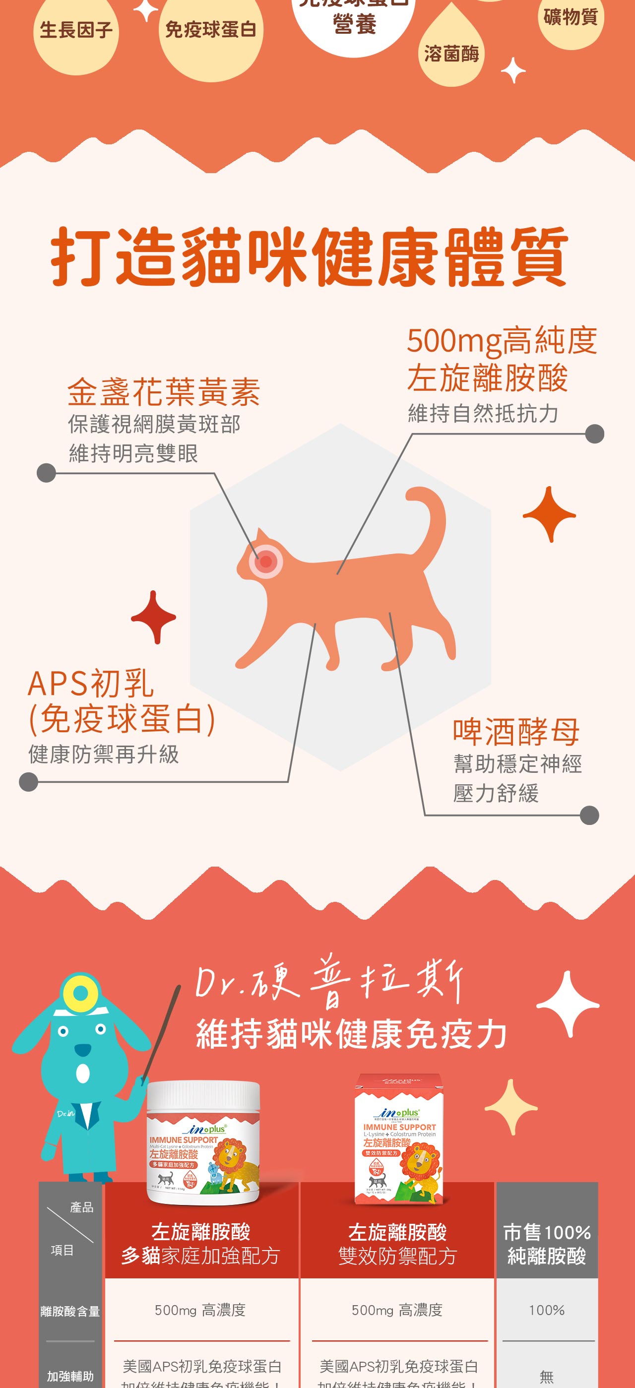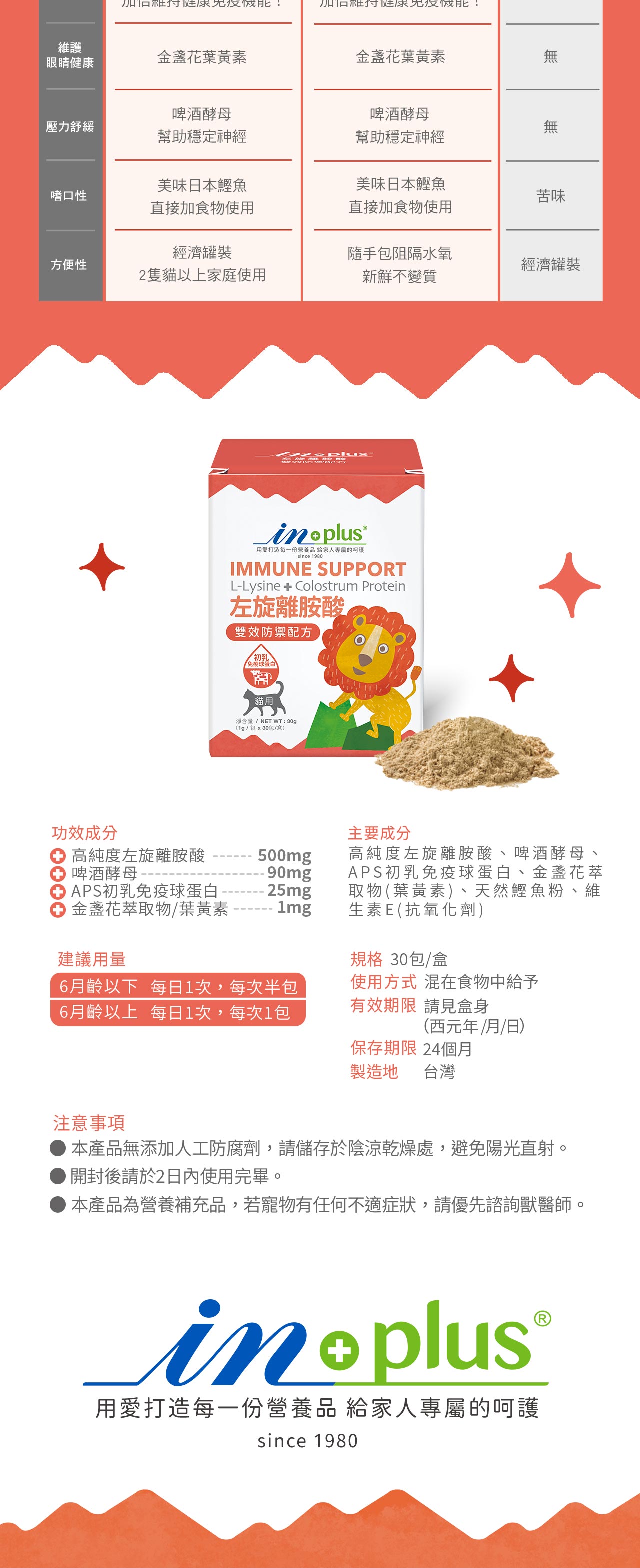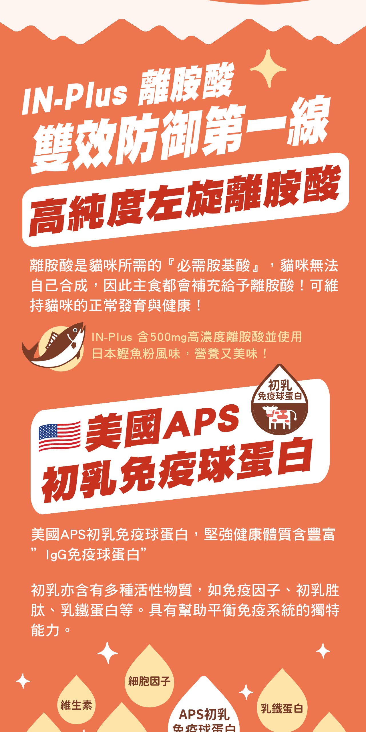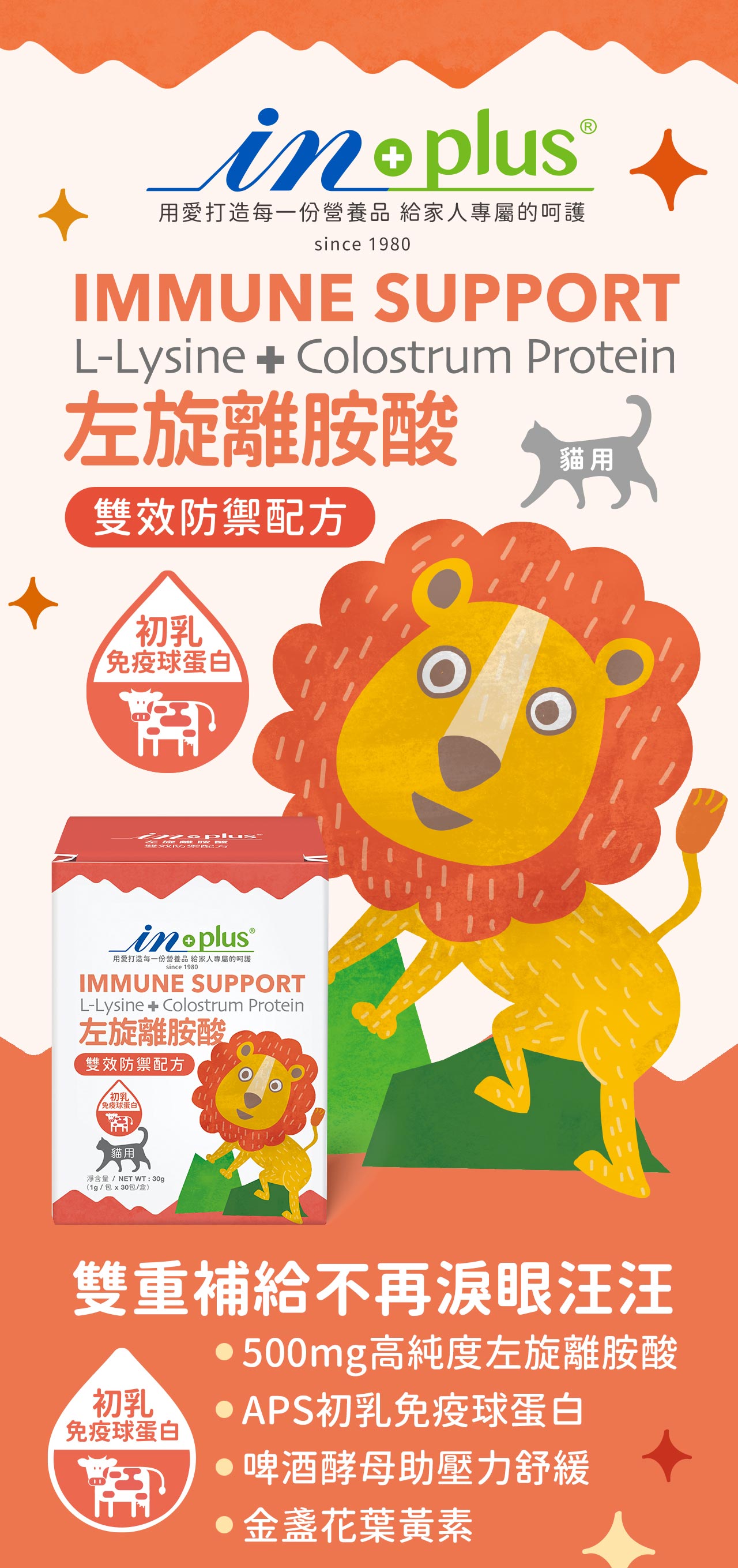 IN-Plus 左旋離胺酸雙效防禦配方,添加高純度左旋離胺酸及初乳免疫球蛋白,給貓咪雙重補給不再淚眼汪汪。另補充金盞花葉黃素,幫助貓咪維持明亮雙眼;啤酒酵母有助穩定神經舒緩壓力。