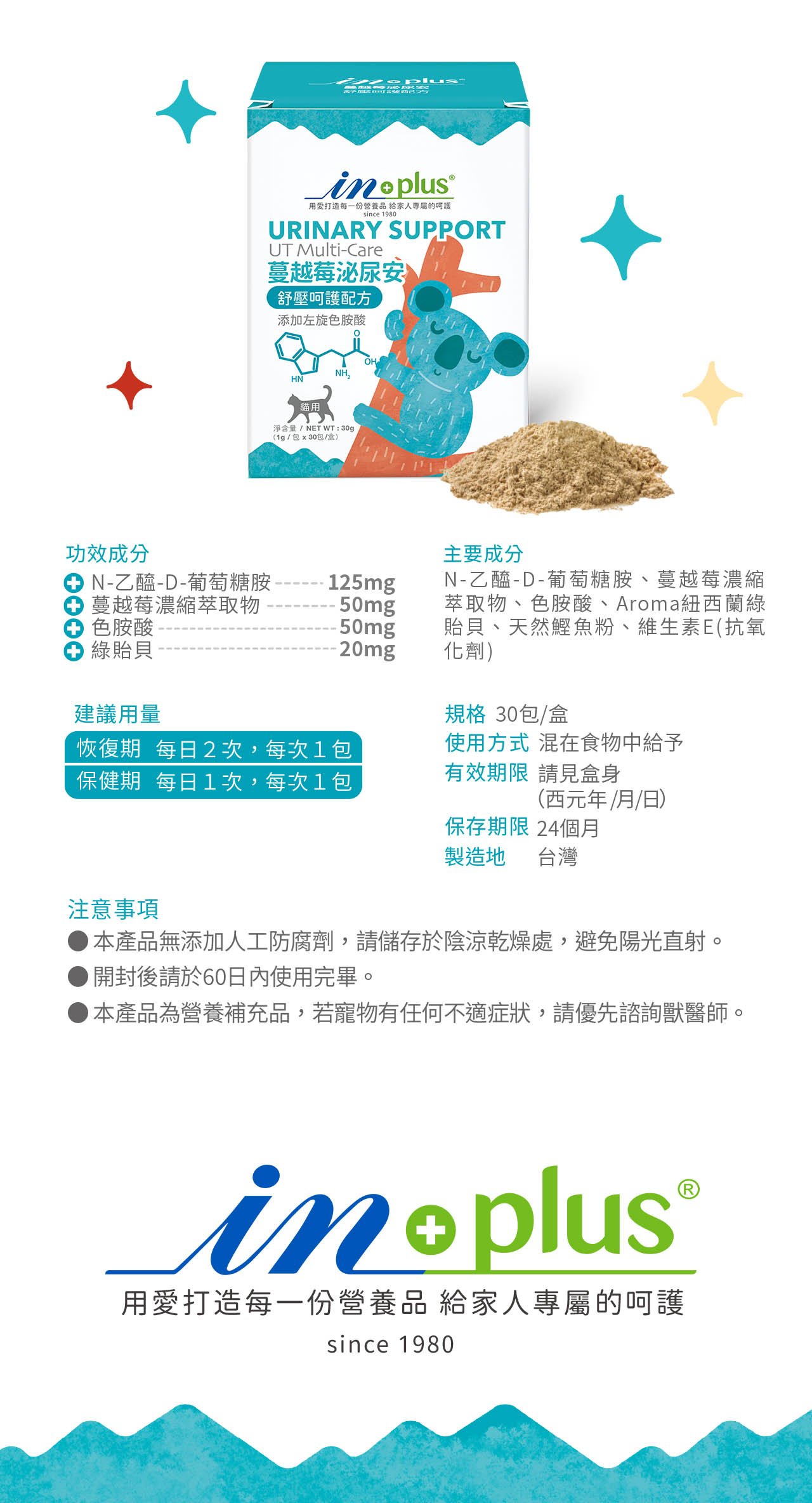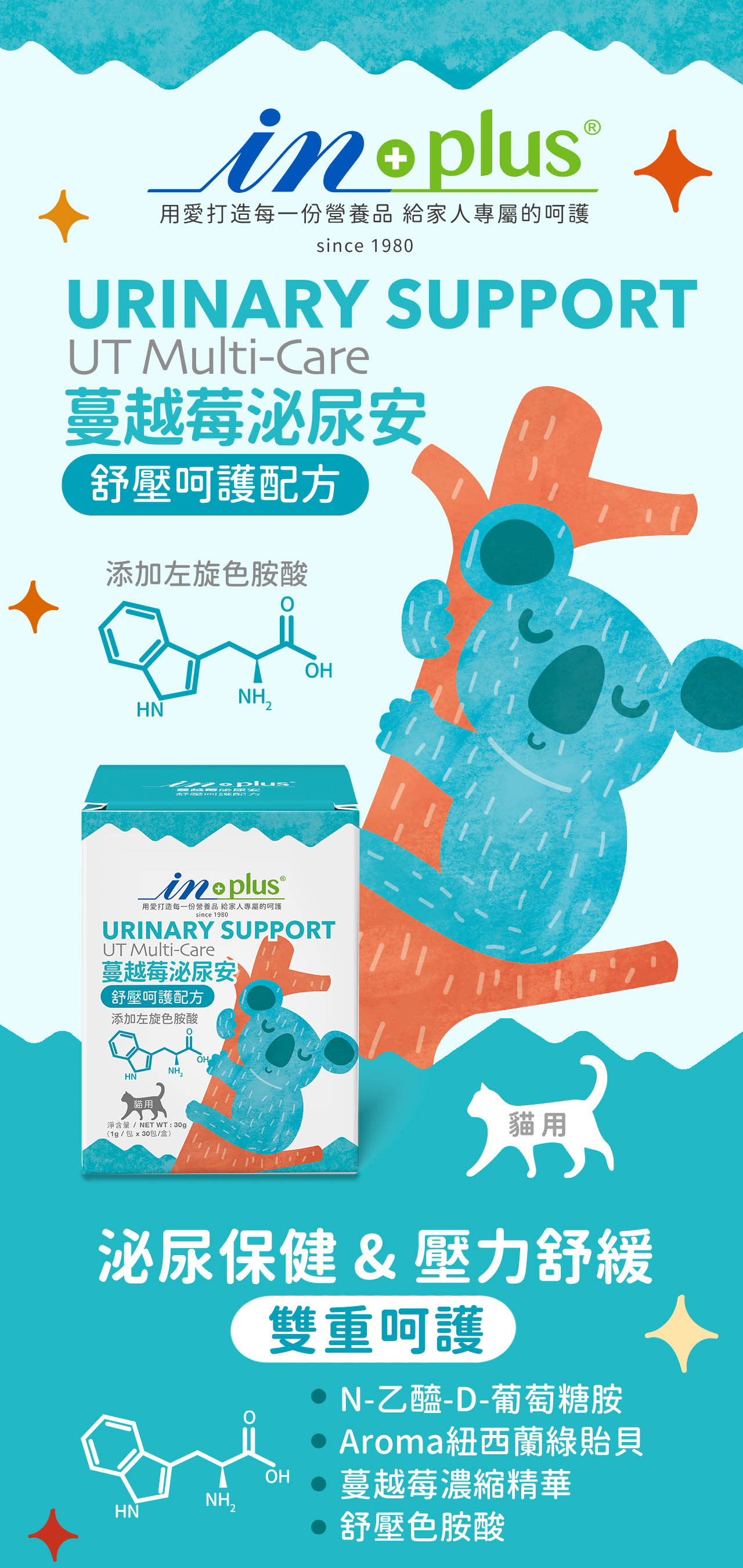 IN-Plus蔓越莓泌尿安─紓壓呵護配方,貓咪專用的蔓越莓,幫助貓咪泌尿道保健。豐富的蔓越莓濃縮精華、葡萄糖胺、綠唇貽貝,幫助維持自然抵抗力以及完整泌尿保健;添加色胺酸,舒緩貓咪壓力,推薦給家中有養貓的家庭。
