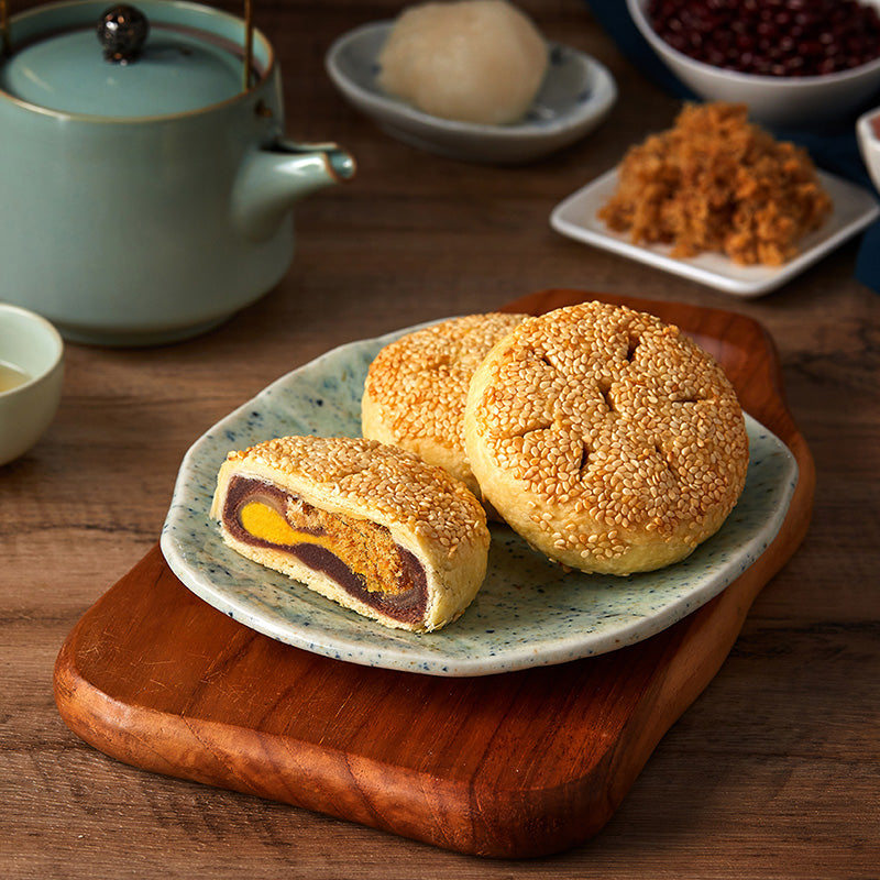 改良傳統喜慶鴛鴦餅,將南北習俗象徵雙雙對對的台式食材結合,紅豆餡鬆軟綿密、麻糬Q彈不黏牙、古早味肉脯醇厚濃郁、碎鹹蛋黃鹹香無腥味,每口都層層綻放懷舊的味蕾記憶,揉合出豐裕的四喜樂章。