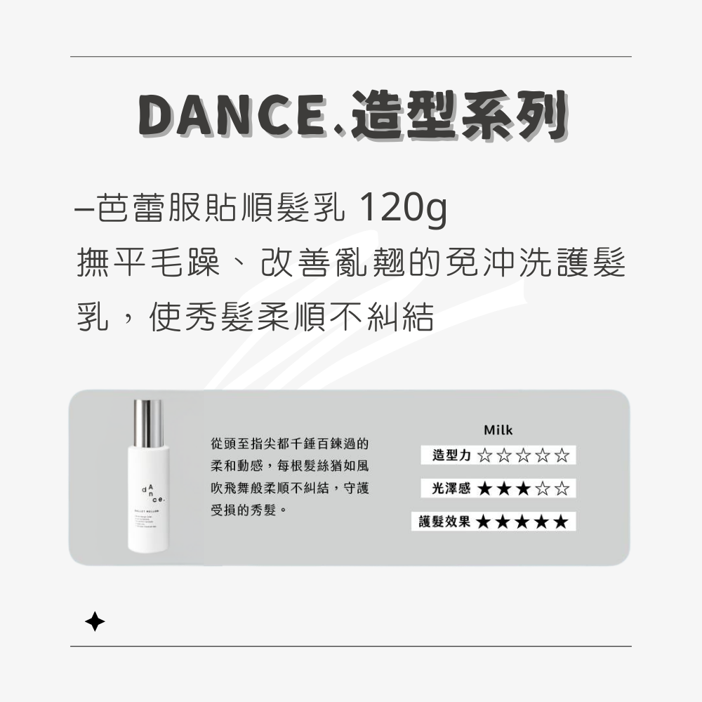 –芭蕾服貼順髮乳 120g撫平毛躁、改善亂翹的免沖洗護髮乳,使秀髮柔順不糾結