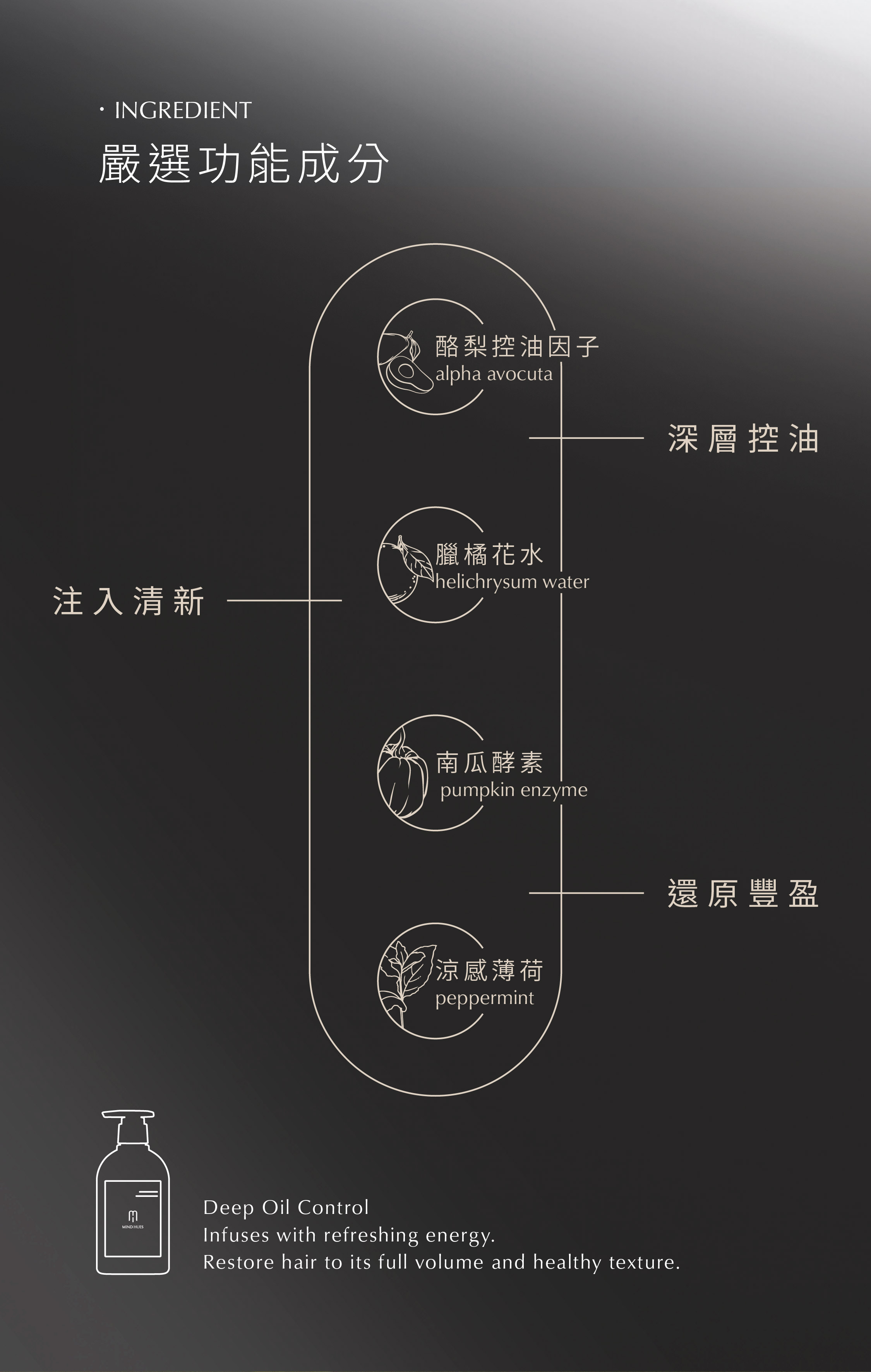 使用白樺樹山毛櫸複合萃取 AQUAXYL、紅花苜蓿及雪絨花三大專利修護成分。蘊含酪梨控油因子、臘橘花水、南瓜酵素及涼感薄荷等植萃,可深層清潔髒污、延緩出油,還原豐盈蓬鬆的效果。