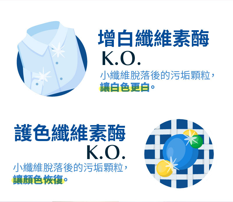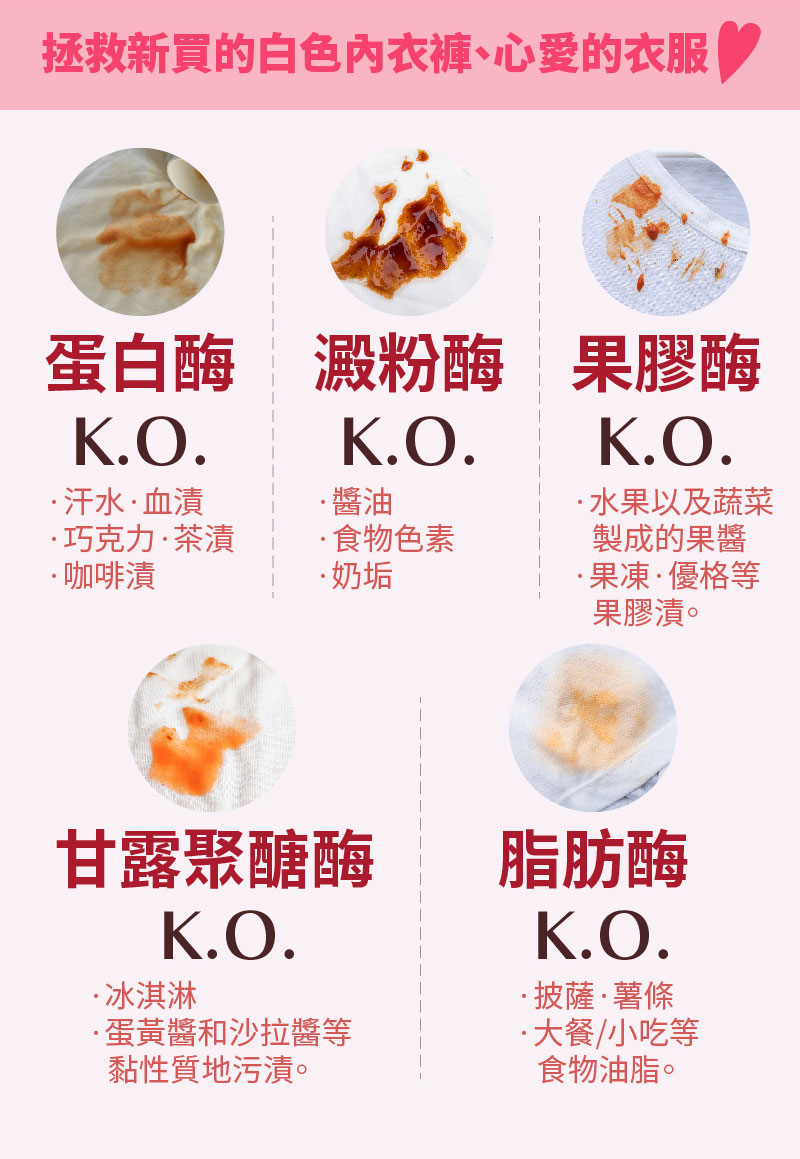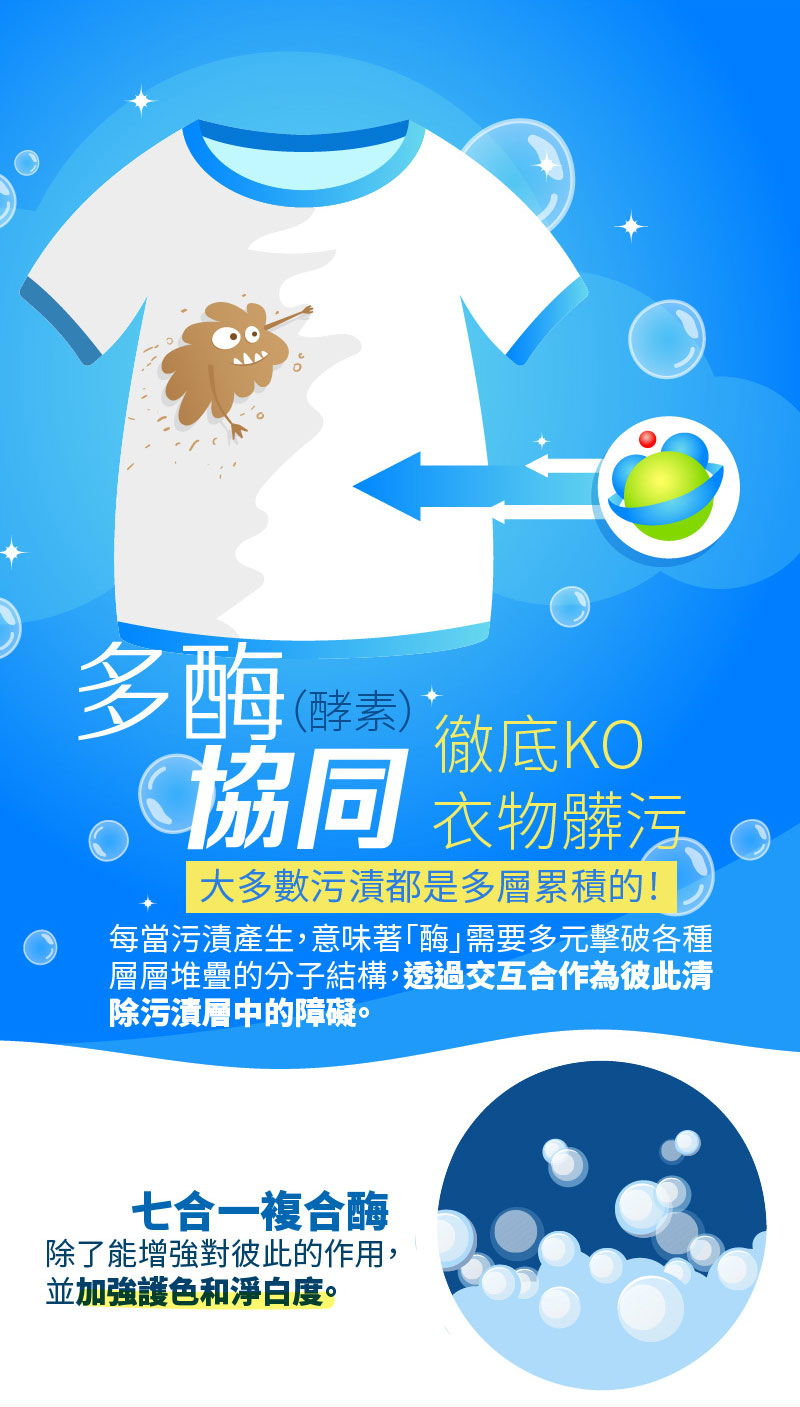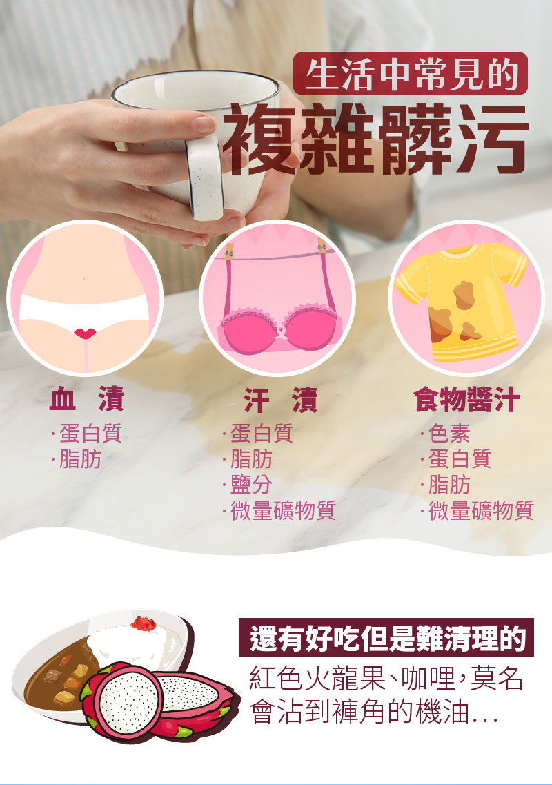 - 七合一酵素,將生活中常見髒污:血漬、汗漬、食物 醬汁、洗得好乾淨!
