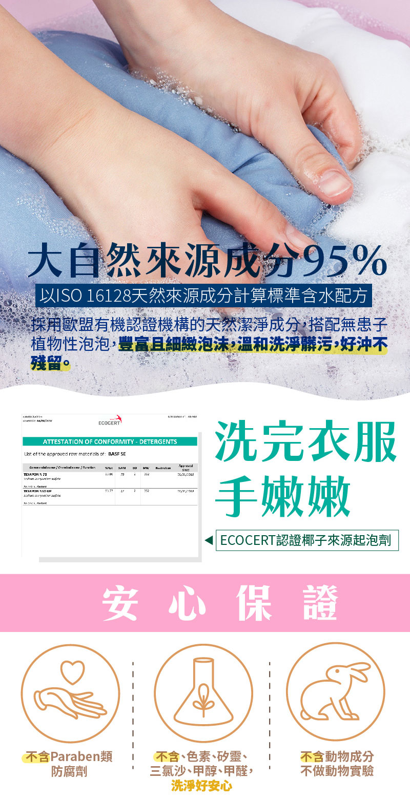 - 不含色素、矽靈、三氯沙、甲醇、甲醛,洗淨好安心