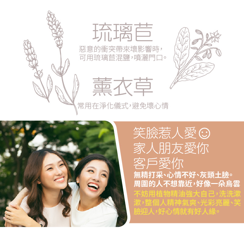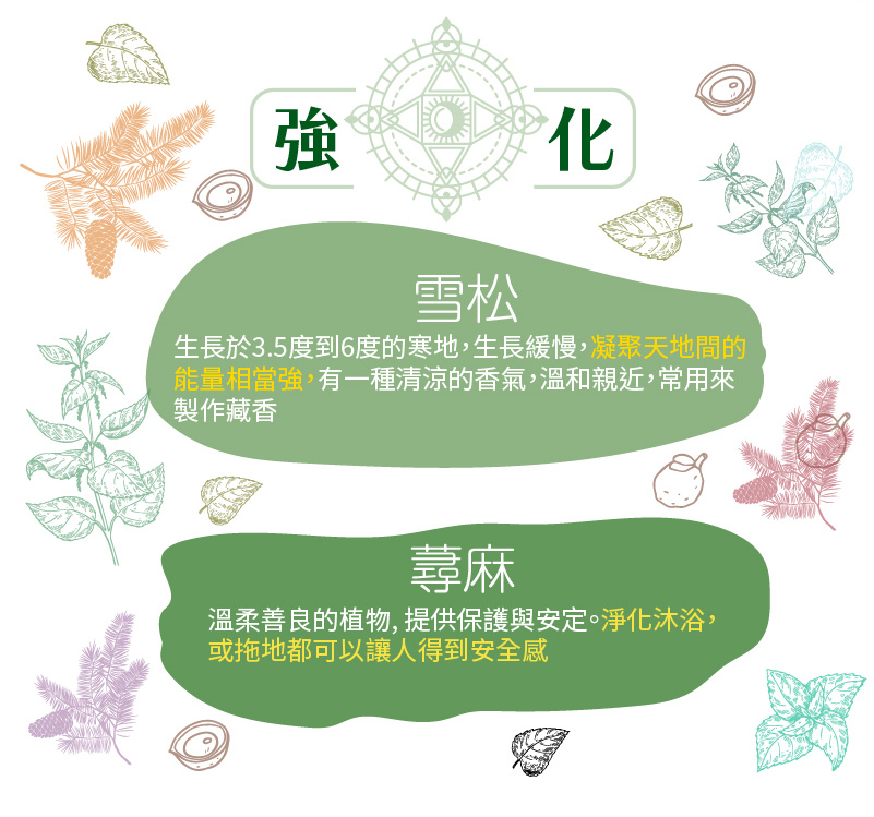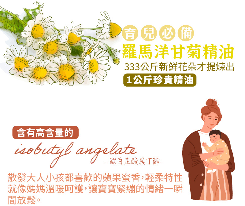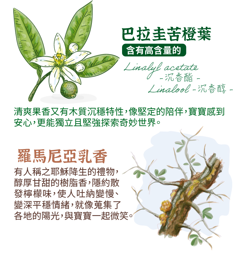 - 馬鬱蘭、羅馬洋甘菊(歐白芷酸異丁酯,會舒壓放鬆)、巴拉圭苦橙葉(含薰香酯)、羅馬尼亞乳香