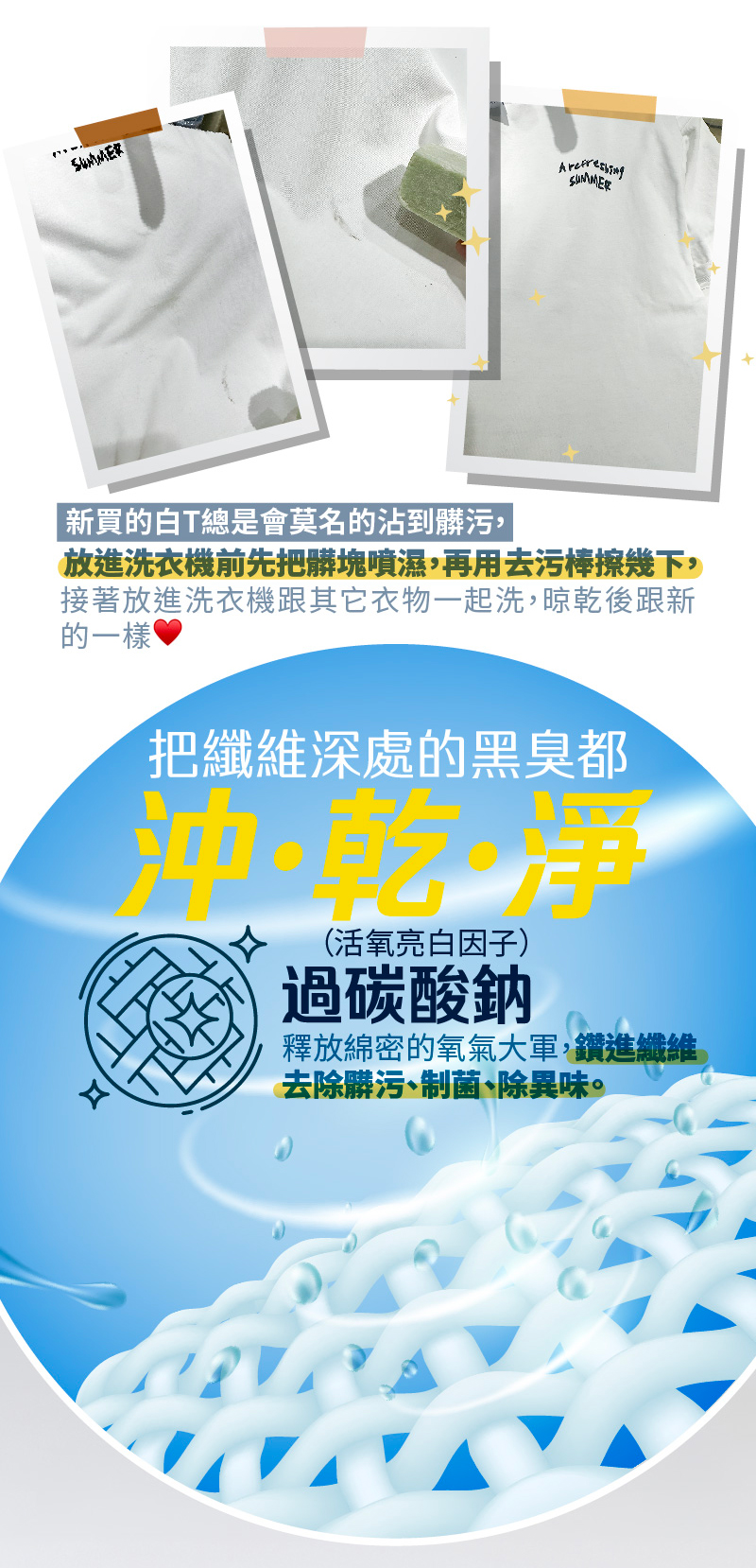- 過碳酸鈉(活氧亮白因子)~鑽進纖維,去除髒污、制菌、除異味。