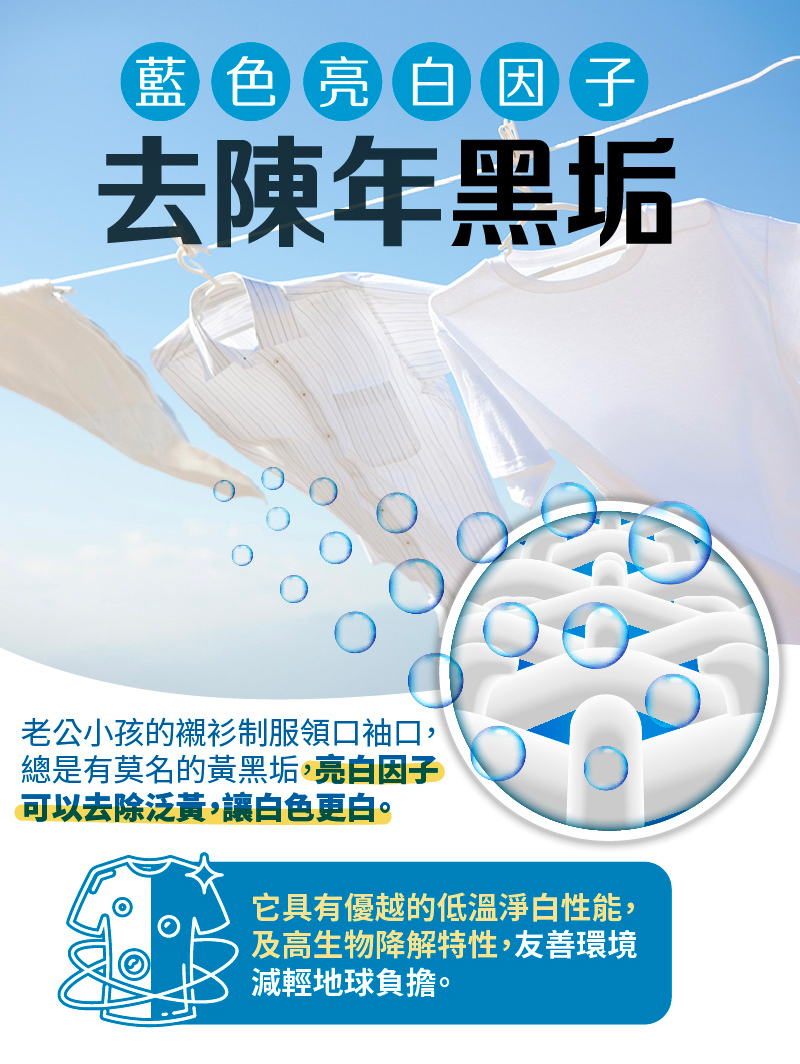 - 藍色亮白因子~去除陳年黑垢、去除泛黃,讓白色更白M