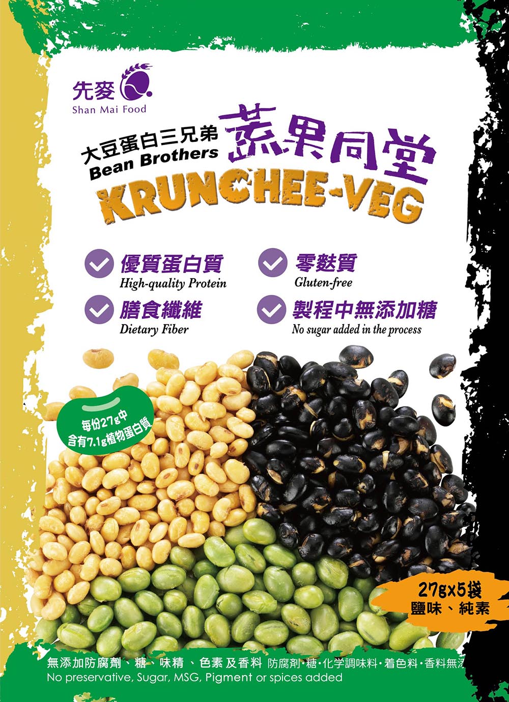 先麥推出【大豆蛋白三兄弟】開袋即食產品,將台灣在地生產的黑豆、黃豆、毛豆,以先進的技術製作,生產過程100%無添加,完整保留優質蛋白質、膳食纖維、無麩質、製程中無添加糖,適合在生活中不同情境補充優質蛋白質:登山旅行、運動健身、游泳瑜珈、早餐宵夜、午茶會議點心、值勤熬夜充飢、泡茶品酒良伴。