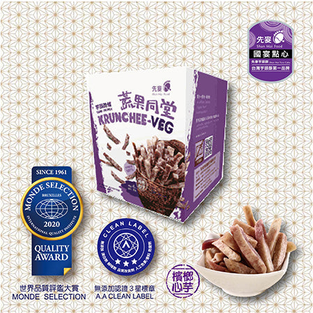 # 先麥KRUNCHEE-VEG蔬果同堂芋頭脆條嚴選大甲檳榔心芋頭製作,採用最新真空處理技術,每10Kg的芋頭經製作處理後僅存3.9Kg芋頭脆條(39%),每一口脆條都吃的到芋頭的原色、原味,讓平常少吃青菜蔬果的大小朋友,真實品嚐台灣農業在地的好滋味。