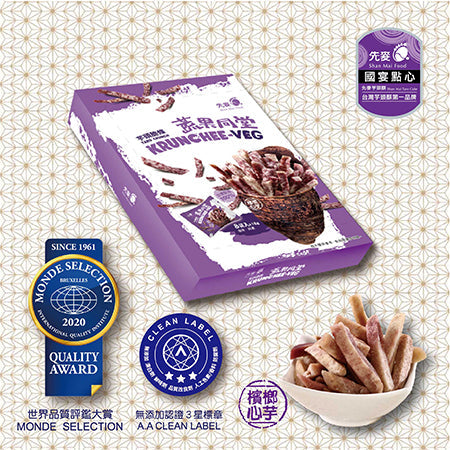 # 先麥KRUNCHEE-VEG蔬果同堂芋頭脆條嚴選大甲檳榔心芋頭製作,採用最新真空處理技術,每10Kg的芋頭經製作處理後僅存3.9Kg芋頭脆條(39%),每一口脆條都吃的到芋頭的原色、原味,讓平常少吃青菜蔬果的大小朋友,真實品嚐台灣農業在地的好滋味。