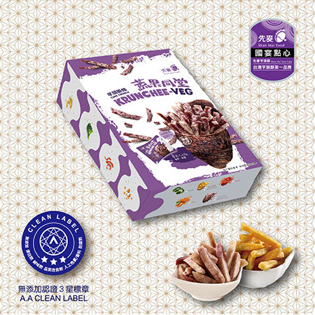 # 先麥KRUNCHEE-VEG蔬果同堂芋頭脆條嚴選大甲檳榔心芋頭製作,採用最新真空處理技術,每10Kg的芋頭經製作處理後僅存3.9Kg芋頭脆條(39%),每一口脆條都吃的到芋頭的原色、原味,讓平常少吃青菜蔬果的大小朋友,真實品嚐台灣農業在地的好滋味。