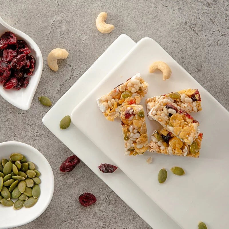 特選飽滿米粒,依循傳統古法製作,將熟米脫水後的「米籽乾」反覆翻炒成型,加入營養滿分的蔓越莓、南瓜子、腰果、杏仁、薏仁、麥片等堅果增添風味層次,小巧一口酥尺寸每口酥脆紮實,香氣豐沛醇厚,口口都是大地果實的美味精華,為午茶時光必備零嘴。