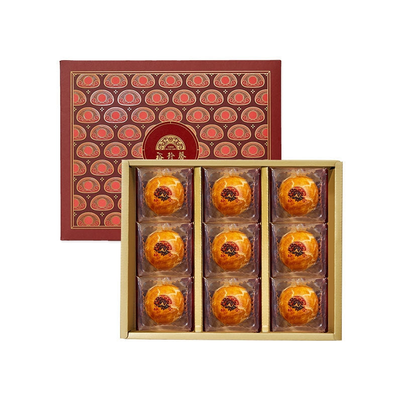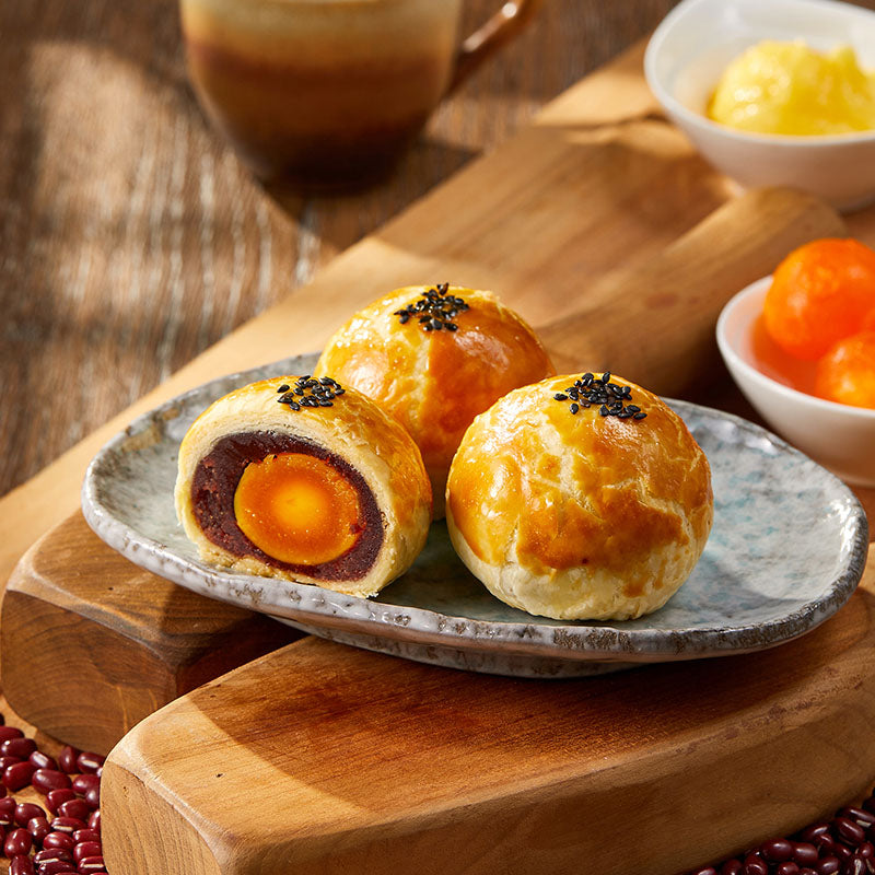 綿密細緻的烏豆沙餡,包裹住一整顆濃醇的鴨蛋蛋黃,搭配低甜度海藻糖,口感滋潤溫順;輕咬一口,層次鮮明的餅皮、化口的紅豆餡、濃郁的蛋黃,一起在口中舞出甜鹹交融圓舞曲,幸福滿點。