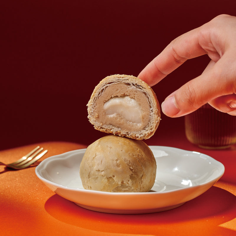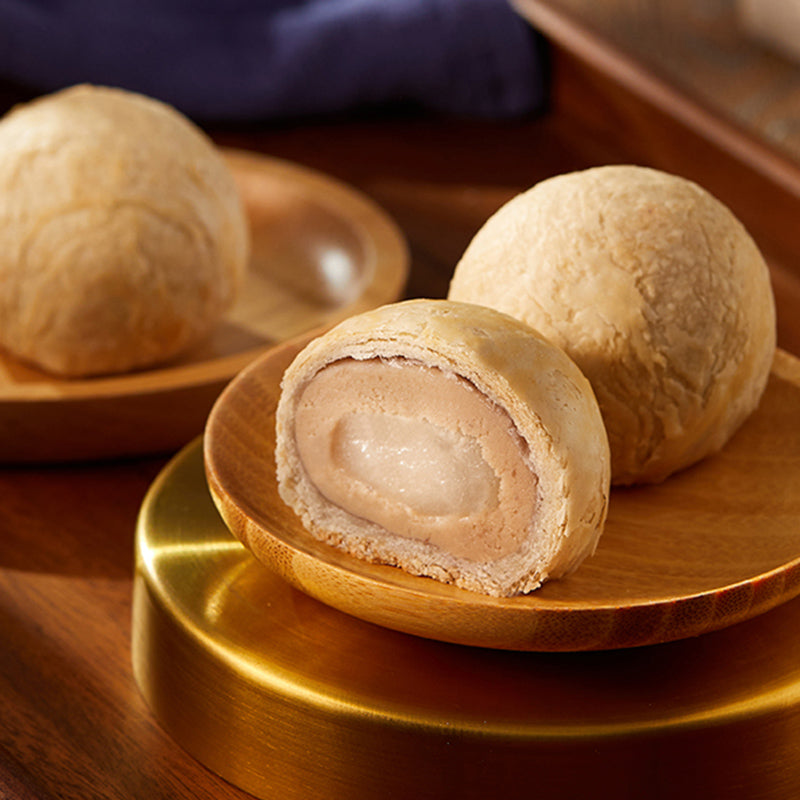 芋頭內餡香氣溫和,外型則烤成膨脹圓滿的球體狀,細心烘烤下的餅皮與皮酥層次分明,口感更顯鮮明豐富,由外而內帶給您酥、鬆、Q多重享受!