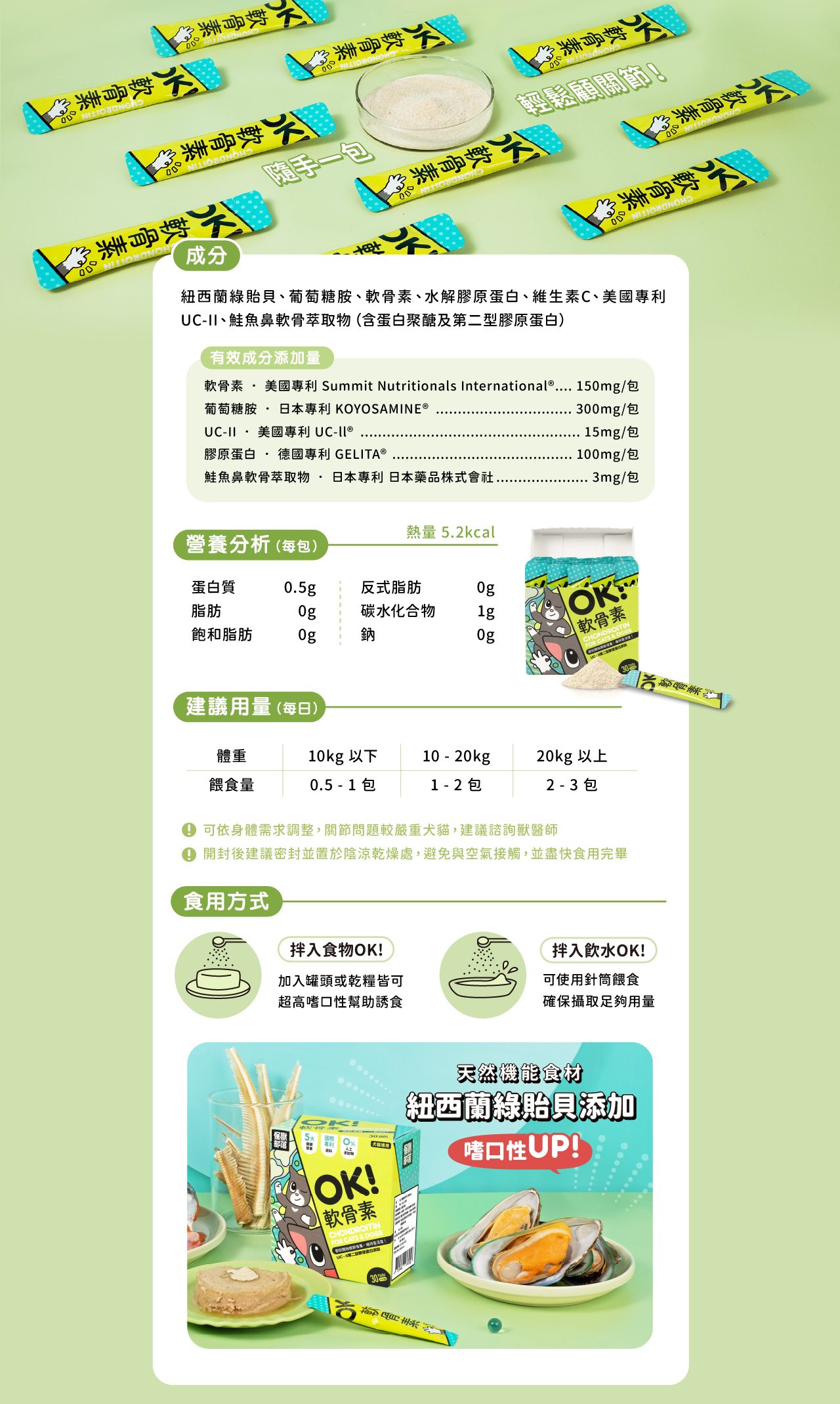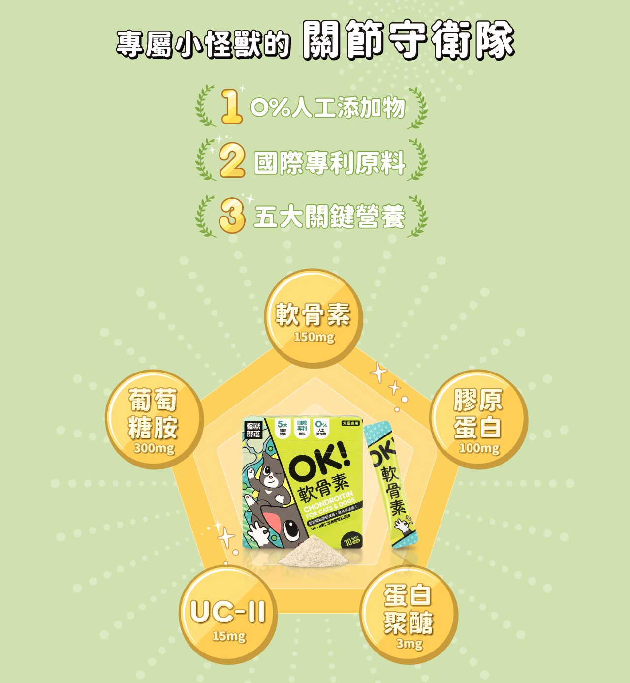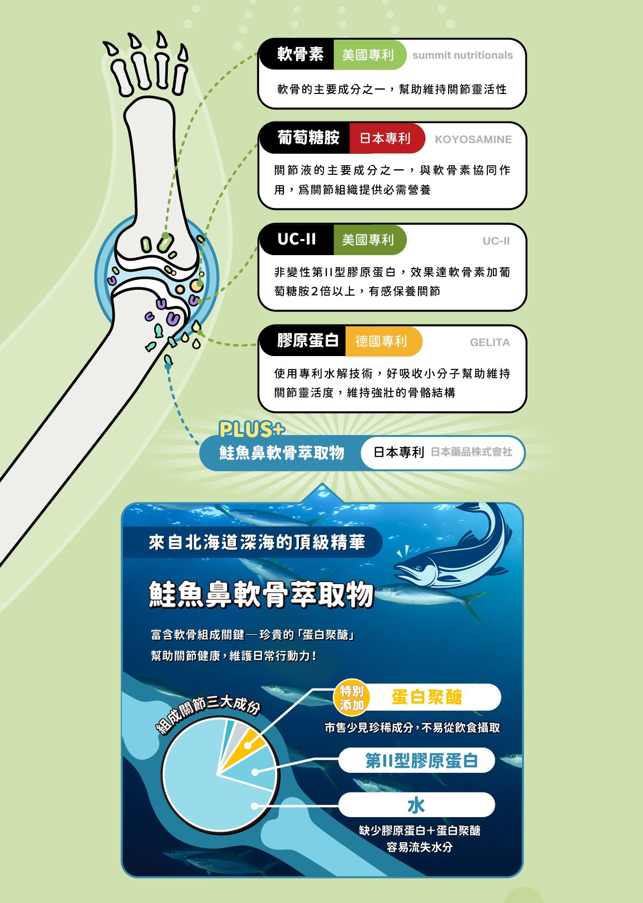 軟骨素+葡萄糖胺+UC-II+膠原蛋白+蛋白聚醣關鍵五大營養讓關節保健,一包OK!