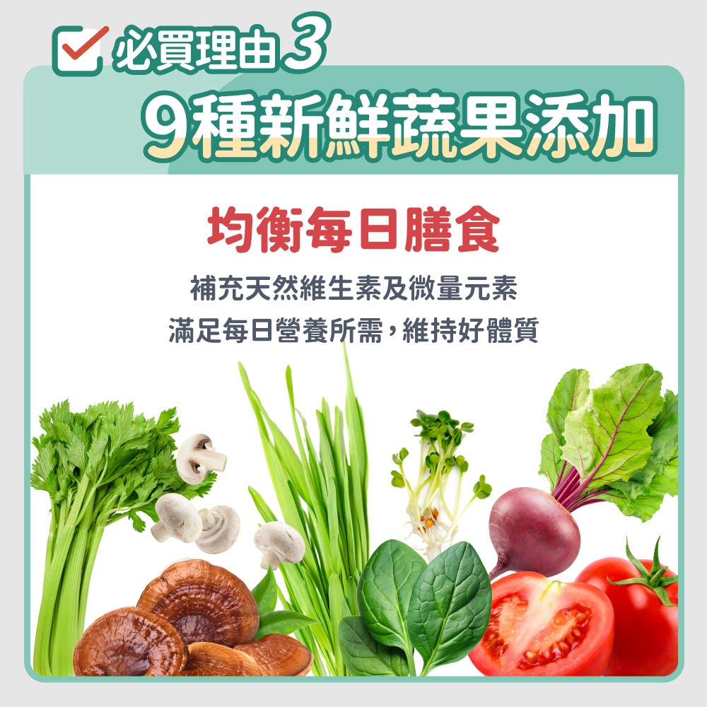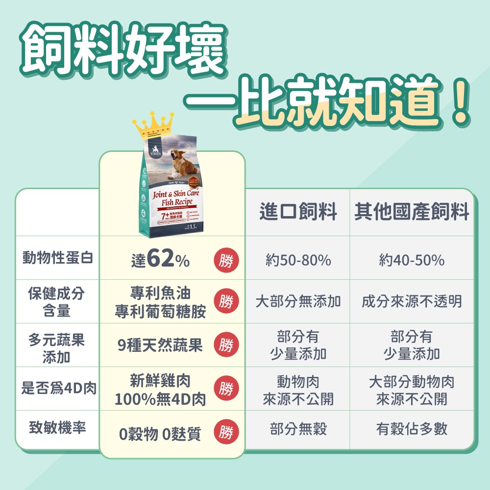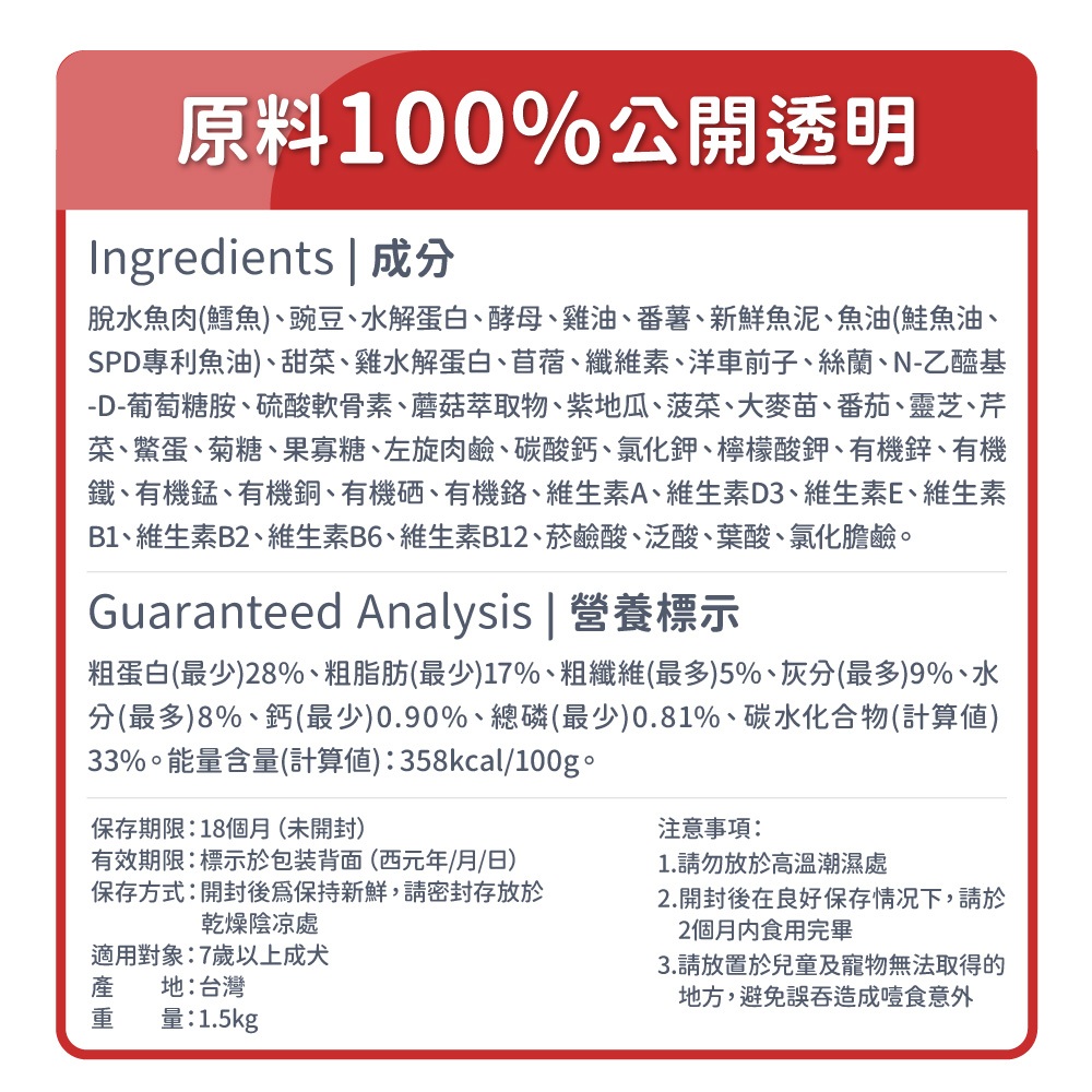脫水魚肉(鱈魚)、豌豆、水解蛋白、酵母、雞油、番薯、新鮮魚泥、魚油(鮭魚 油、SPD 專利魚油)、甜菜、雞水解蛋白、苜蓿、纖維素、洋車前子、絲蘭、N- 乙醯基-D-葡萄糖胺、硫酸軟骨素、蘑菇萃取物、紫地瓜、菠菜、大麥苗、番 茄、靈芝、芹菜、鱉蛋、菊糖、果寡糖、左旋肉鹼、碳酸鈣、氯化鉀、檸檬酸 鉀、有機鋅、有機鐵、有機錳、有機銅、有機硒、有機鉻、維生素 A、維生素 D3、維生素 E、維生素 B1、維生素 B2、維生素 B6、維生素 B12、菸鹼酸、泛酸、 葉酸、氯化膽鹼。