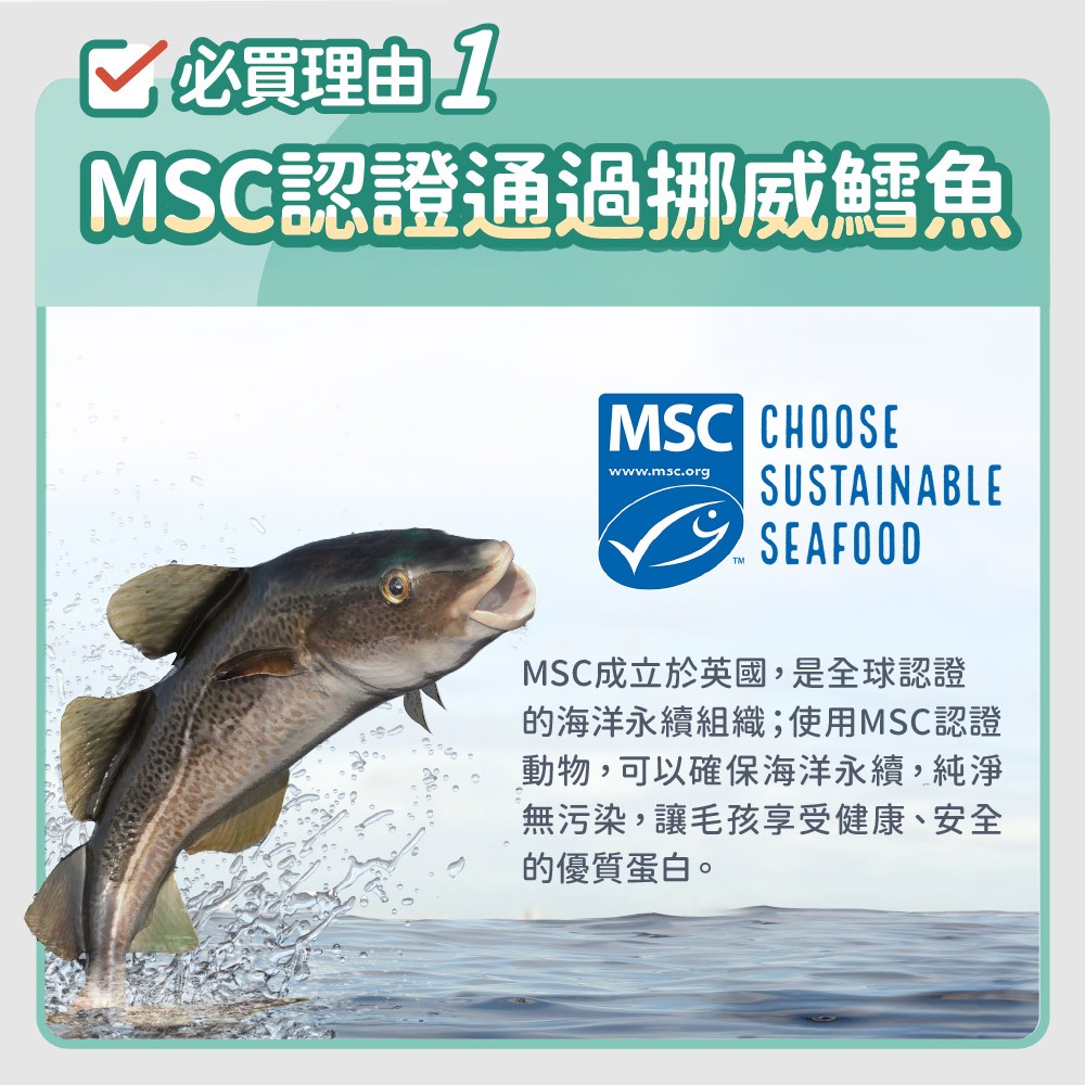 脫水魚肉(鱈魚)、酵母、豌豆、水解蛋白、雞油、番薯、新鮮鮭魚泥、魚油(鮭魚油、SPD 專利魚油(含 omega-3))、纖維素、洋車前子、絲蘭、N-乙醯基-D-葡萄糖胺、硫酸軟骨素、蘑菇萃取物、鱉蛋、菊糖、果寡糖、左旋肉鹼、牛磺酸、甲硫胺酸、碳酸鈣、氯化鉀、檸檬酸鉀、有機鋅、有機鐵、有機錳、有機銅、有機硒、有機鉻、維生素 A、維生素 D3、維生素 E、維生素 B1、維生素 B2、維生素 B6、維生素 B12、菸鹼酸、泛酸、葉酸、氯化膽鹼。