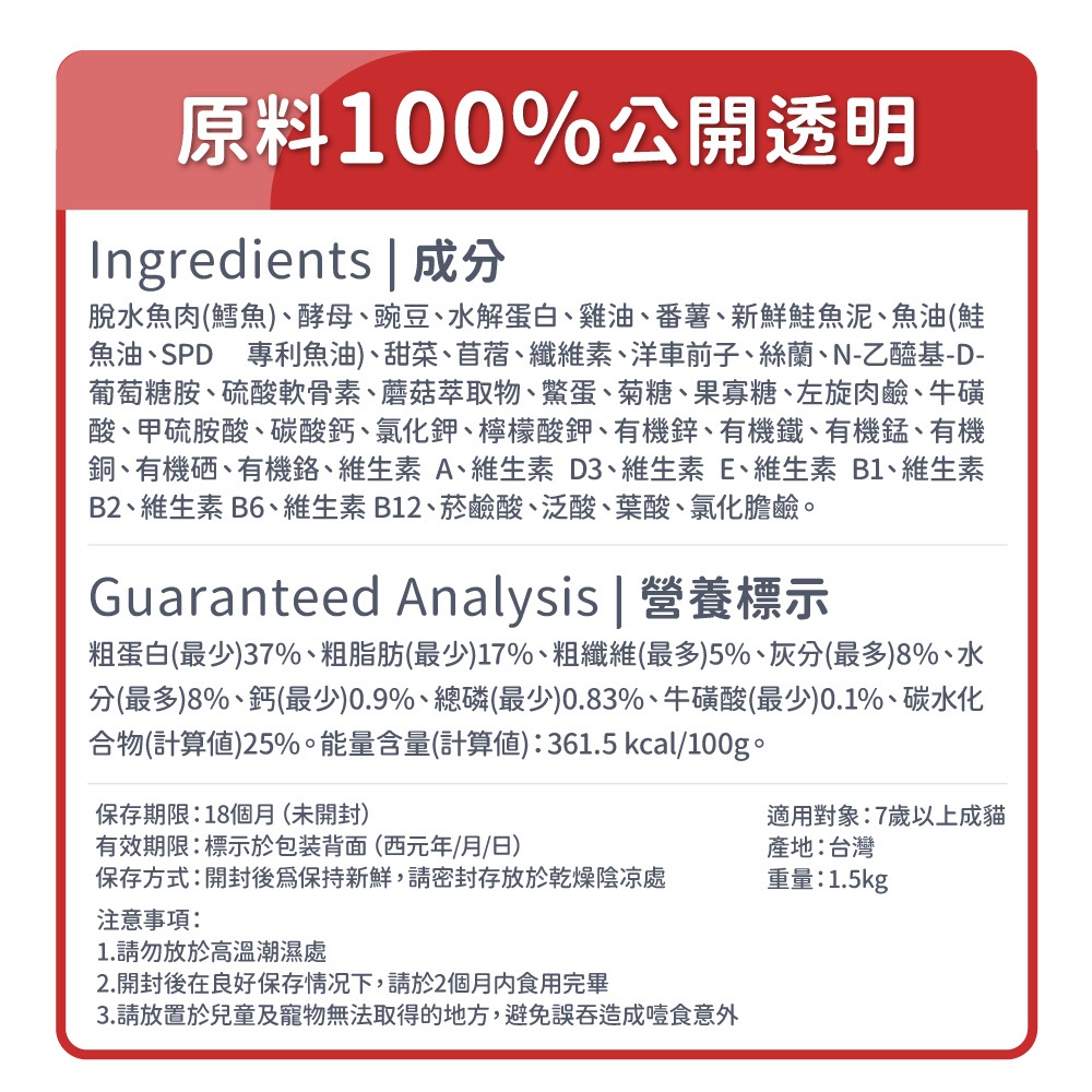 粗蛋白(最少)37%、粗脂肪(最少)17%、粗纖維(最多)5%、灰分(最多)8%、水分(最多)8%、鈣(最少)0.9%、總磷(最少)0.83%、牛磺酸(最少)0.1%、碳水化合物25%。能量值:361.5 kcal/100g。