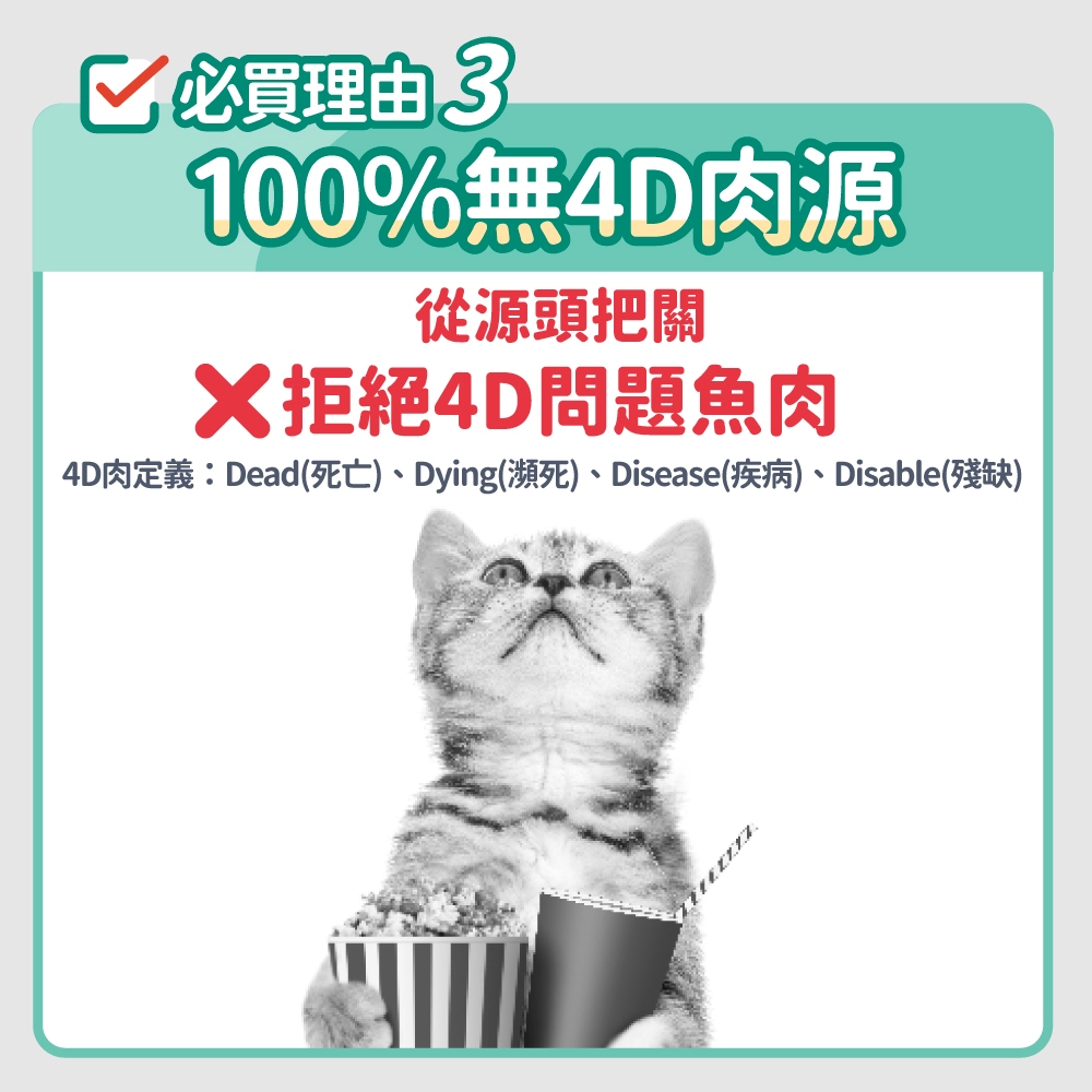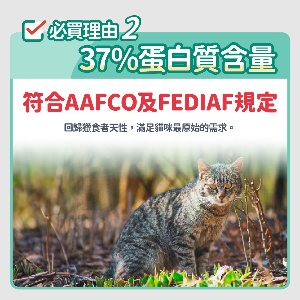 粗蛋白質(最少)37%、粗脂肪(最少)18%、粗纖維(最多)5%、灰分(最多)10%、水分(最多)10%、鈣(最少)1%、總磷(最少)0.84%、牛磺酸(最少)0.13%、碳水化合物20%。能量值:352.5kcal/100g。