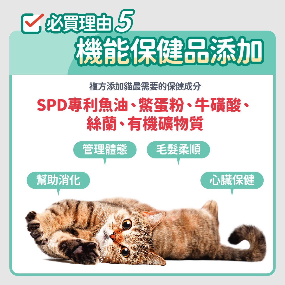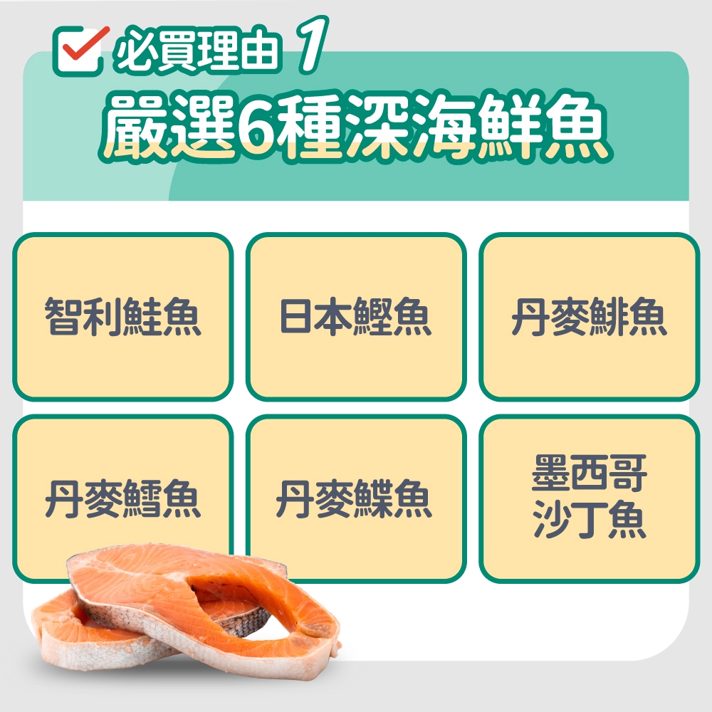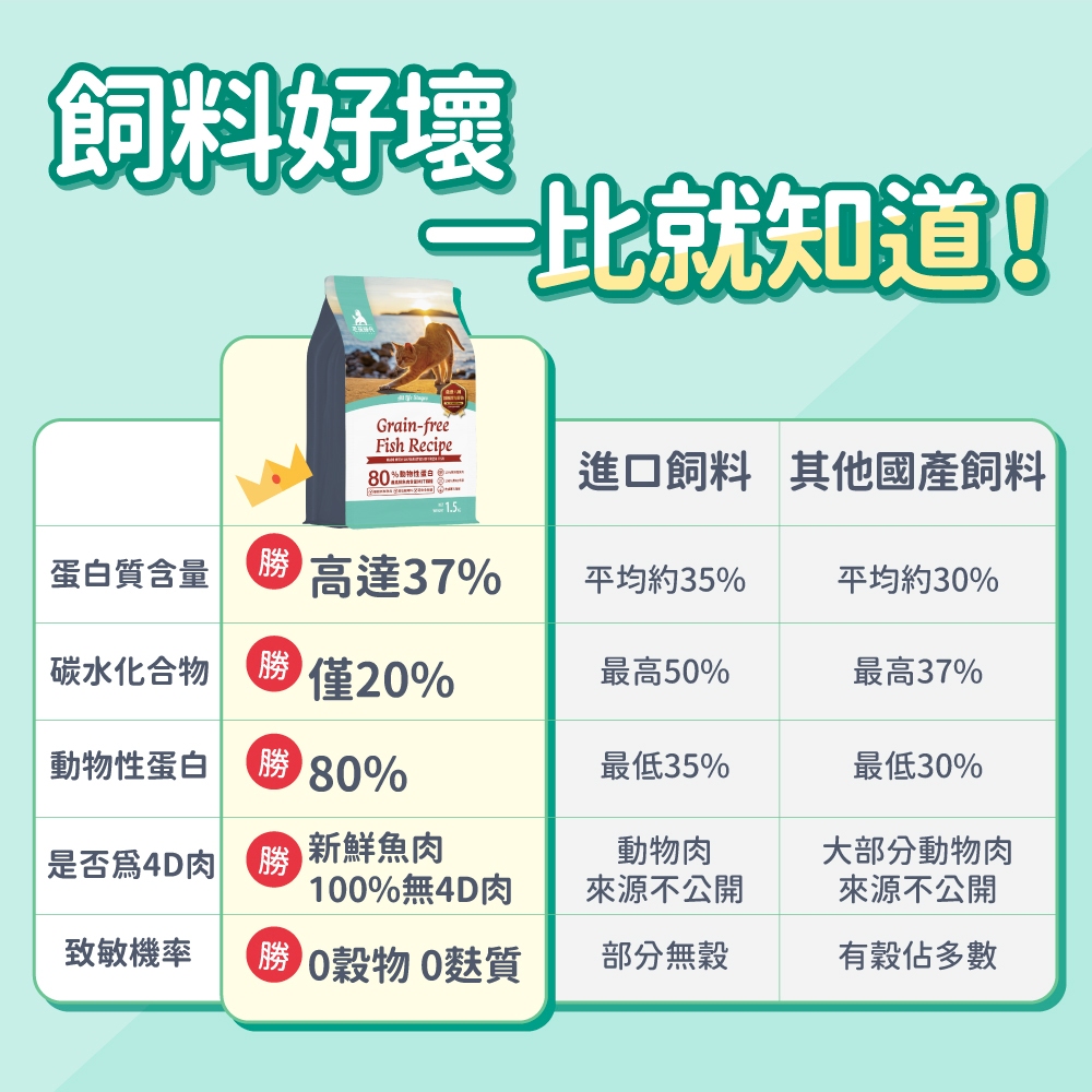脫水魚肉(日本鰹魚、丹麥鯡魚、丹麥鱈魚、丹麥鰈魚、墨西哥沙丁魚)、豌豆、雞油、新鮮鮭魚泥(智利)、番薯、魚油(鮭魚油、SPD專利魚油)、酵母、甜菜、木質纖維、首蓿、絲蘭、鱉蛋、菊糖、果寡糖、牛磺酸、甲硫胺酸、有機鋅、有機鐵、有機錳、有機銅、有機硒、有機銘、維生素A、維生素D3、維生素E、維生素B1、維生素B2、維生素B6、維生素B12、菸鹼酸、泛酸、葉酸、膽鹼。