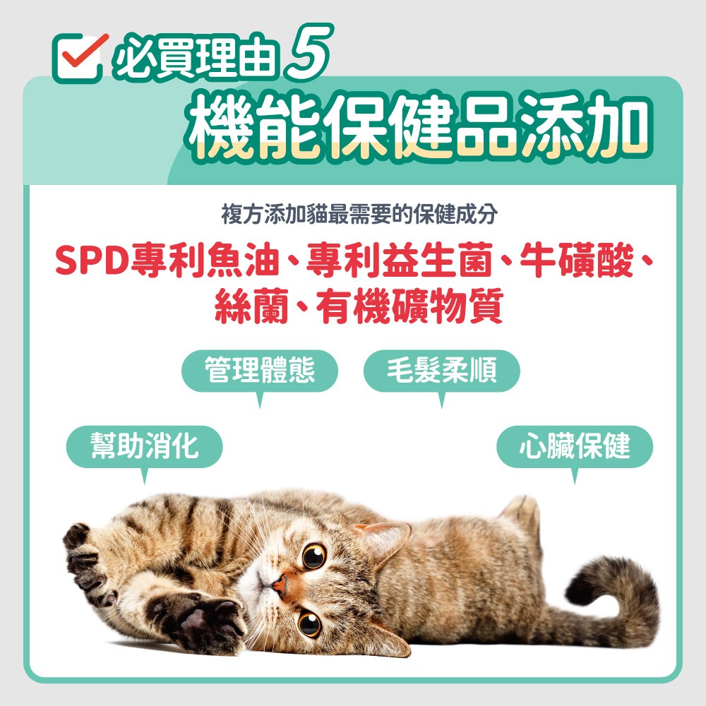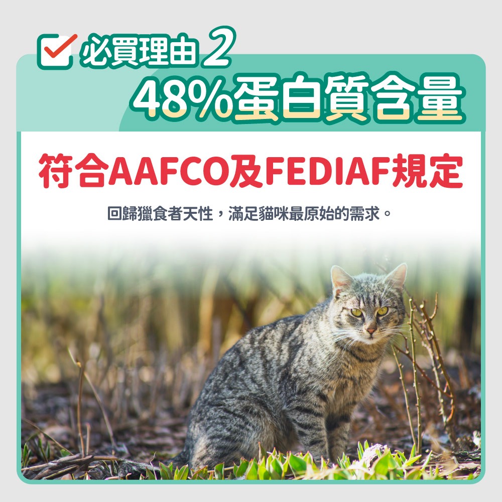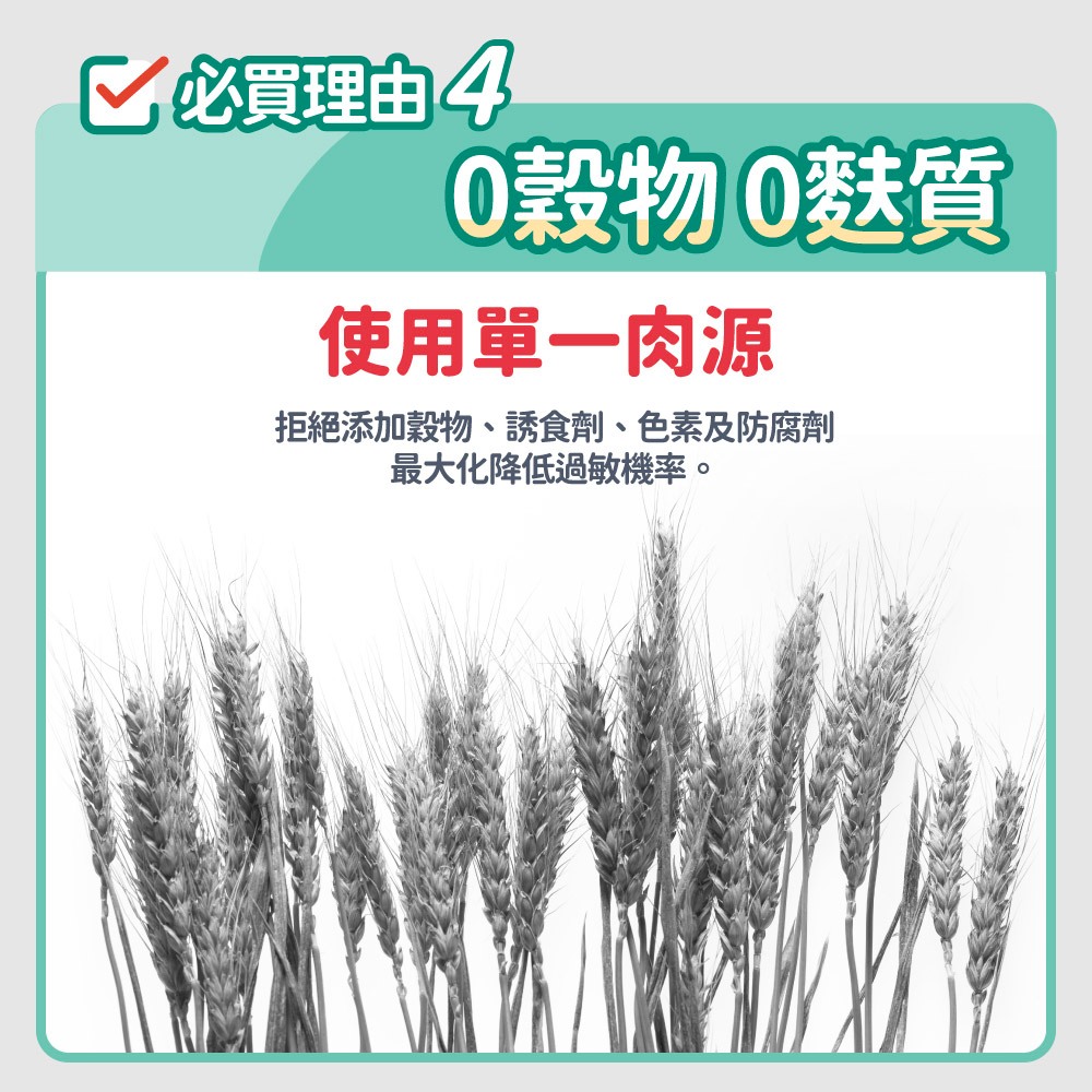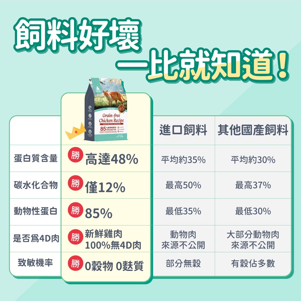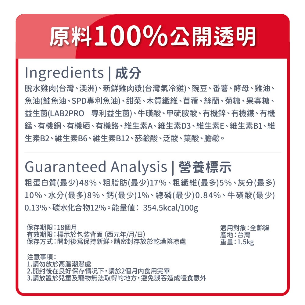 脫水雞肉(台灣、澳洲)、新鮮雞肉漿(台灣氣冷雞)、豌豆、番薯、酵母、雞油、魚油(鮭魚油、SPD專利魚油)、甜菜、木質纖維、首蓿、絲蘭、菊糖、果寡糖、益生菌(LAB2PRO 專利益生菌)、牛磺酸、甲硫胺酸、有機鋅、有機鐵、有機錳、有機銅、有機硒、有機銘、維生素A、維生素D3、維生素E、維生素B1、維生素B2、維生素B6、維生素B12、菸鹼酸、泛酸、葉酸、膽鹼。