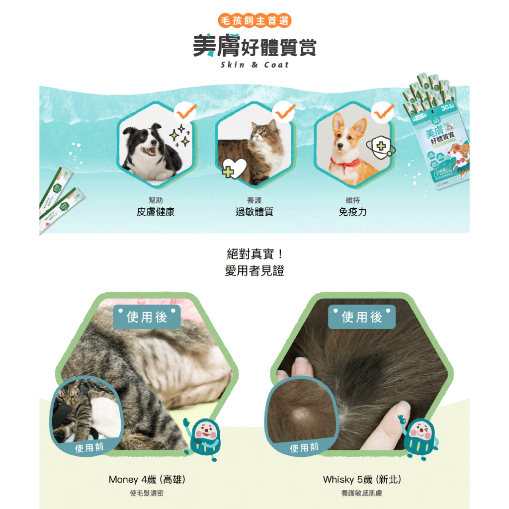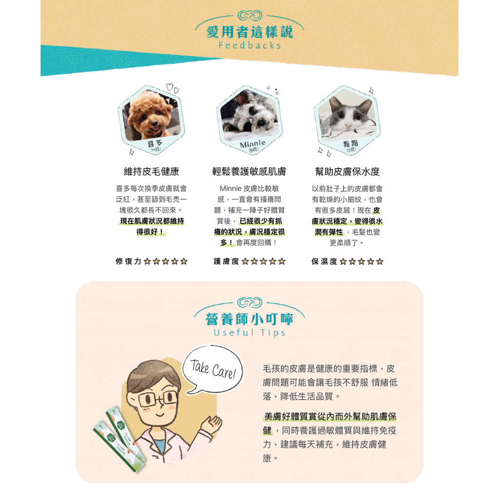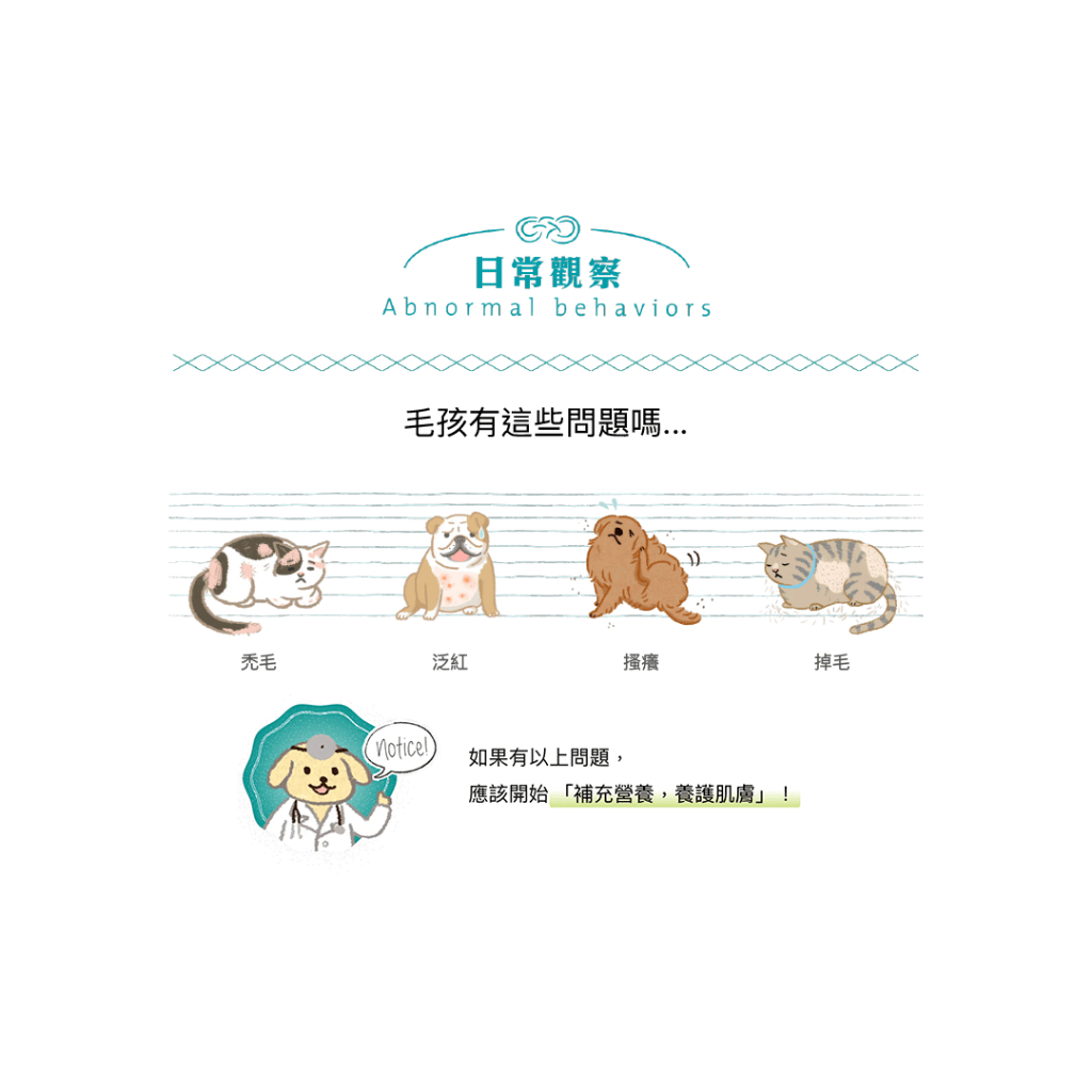 ✔ 調理膚質,皮膚敏感、搔癢、掉毛適用✔ 養護過敏體質,幫助肌膚狀況穩定✔ 維持免疫力,支持皮膚天然屏障✔ 幫助維持皮毛良好狀態