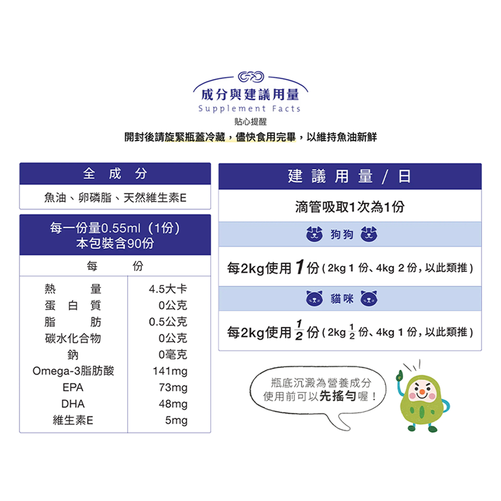 ※因魚油本身油脂含量豐富,若之前沒有食用過魚油相關產品且腸胃比較敏感的毛孩,建議先從少量給予,再逐日增加至所需的劑量。