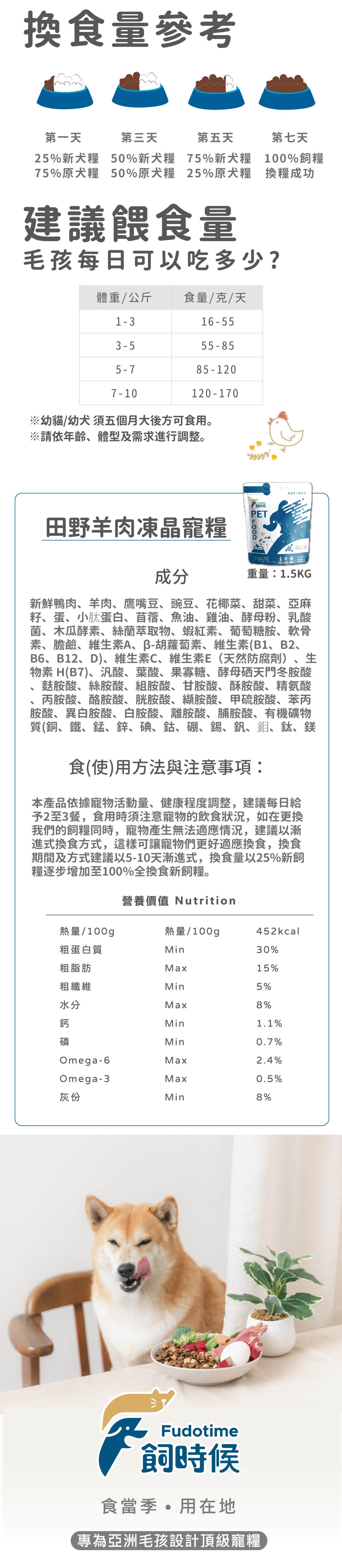 本產品依據寵物活動量、健康程度調整,建議每日給予2至3餐,食用時須注意寵物的飲食狀況,如在更換我們的飼糧同時,寵物產生無法適應情況,建議以漸進式換食方式,這樣可讓寵物們更好適應換食,換食期間及方式建議以5-10天漸進式,換食量以25%新飼糧逐步增加至100%全換食新飼糧。