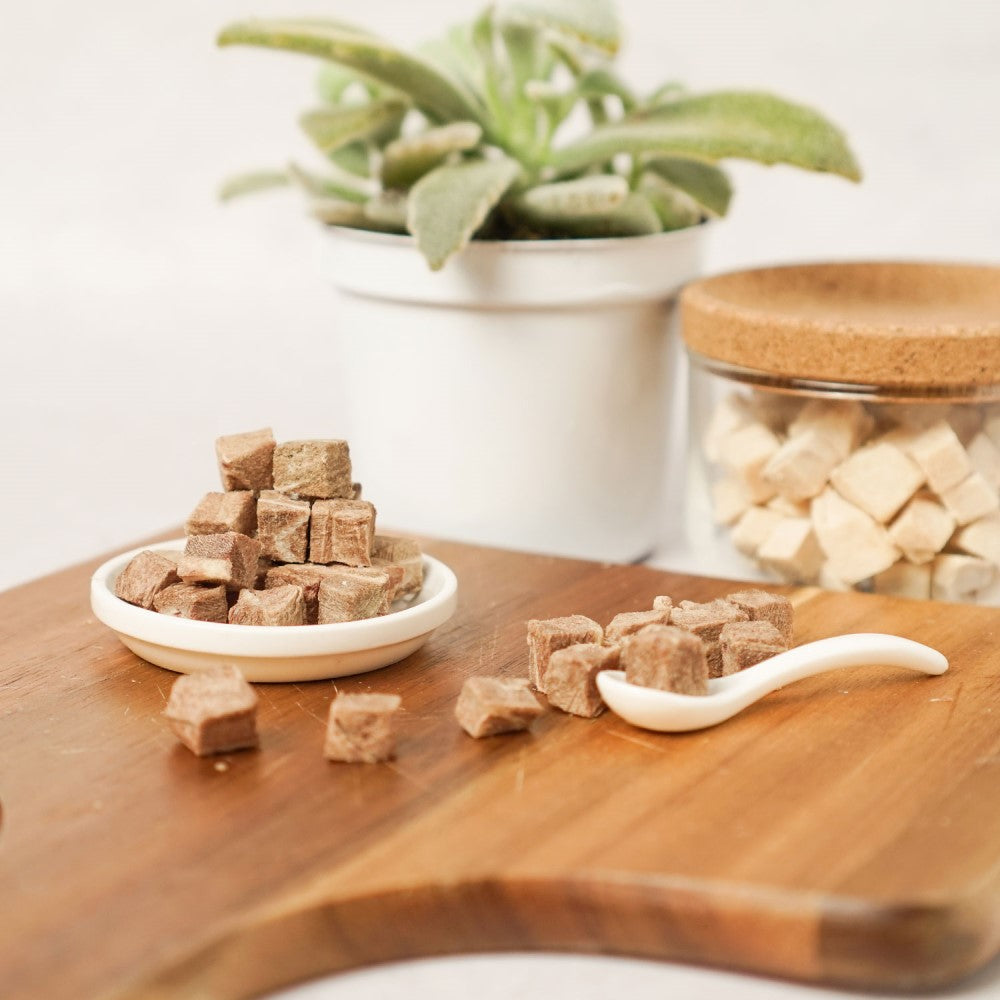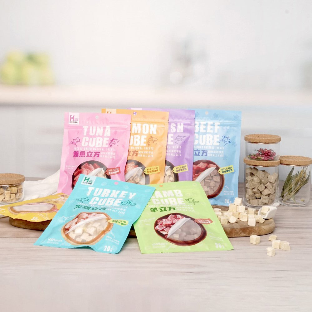 採用嚴選100%鮮肉食材,冷凍乾燥製成,減少營養流失 小小立方,原汁原味的鮮美饗宴,一口一塊剛剛好 絕無添加人工添加物、防腐劑、色素
