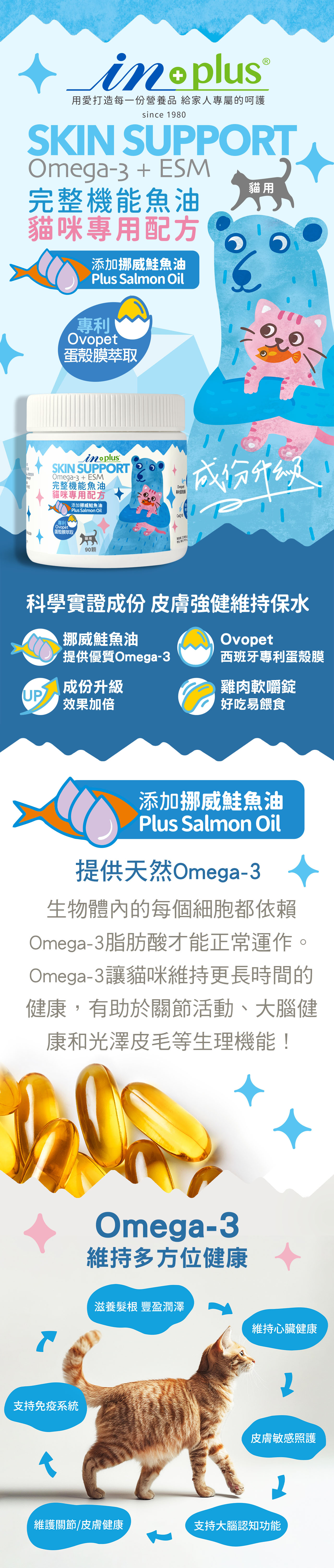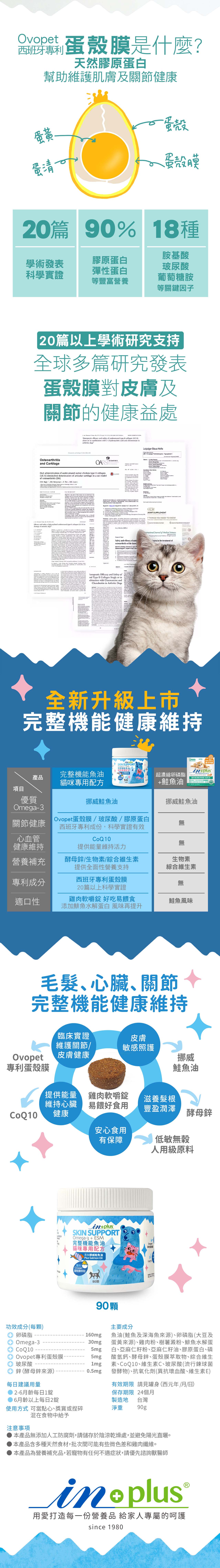 In-Plus完整型機能魚油嚼錠─貓咪專用配方,對毛髮、心臟、關節有完整機能健康維持。添加Ovopet西班牙專利蛋殼膜,科學實證,可以維持關節舒適;挪威鮭魚油則能幫助照護皮膚敏感;CoQ10維持心臟健康。雞肉軟嚼錠形式,好餵食、適口性佳,低敏無穀配方,使用人用級原料,餵食更安心。