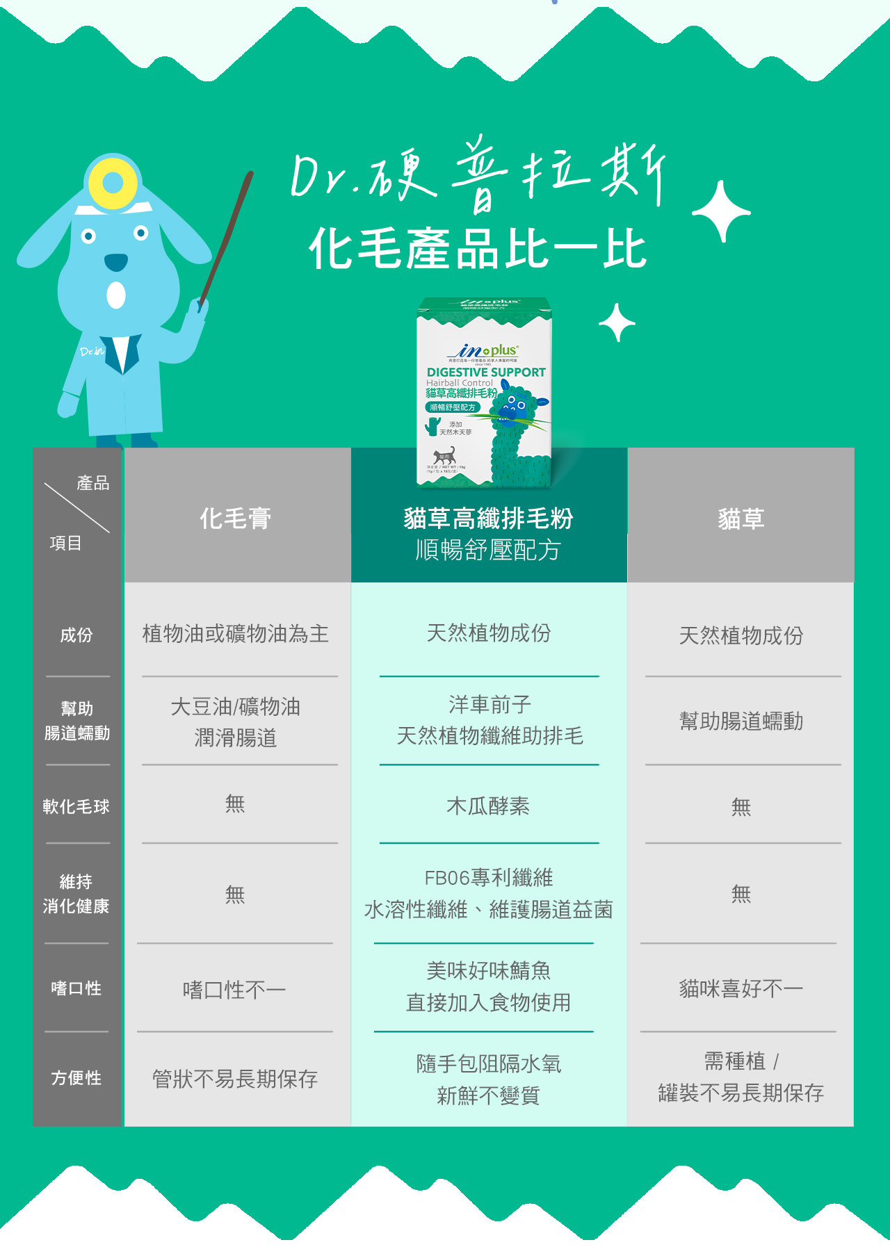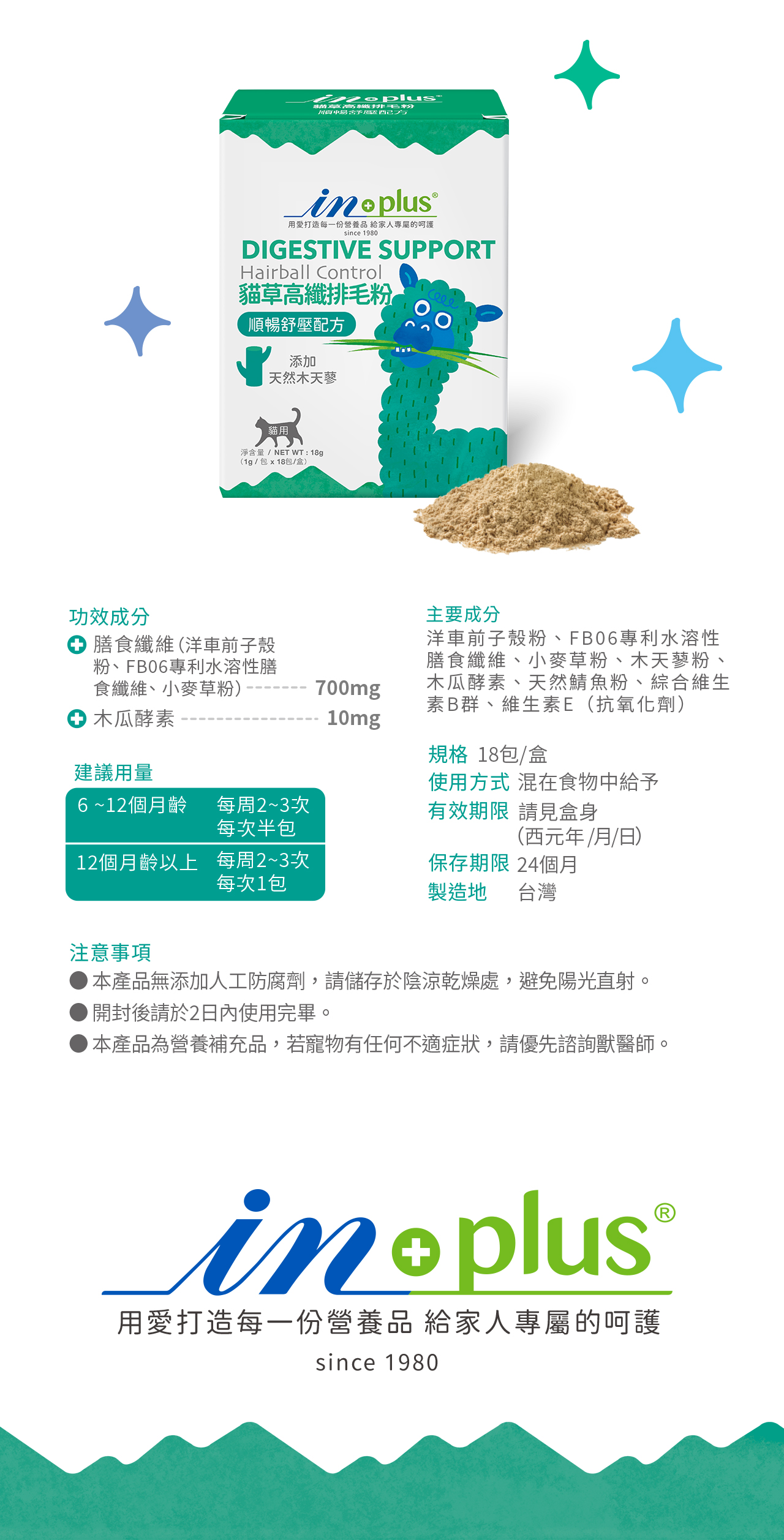IN-Plus 貓草高纖排毛粉─順暢舒壓配方,添加洋車前子與專利膳食纖維,以天然纖維,幫助貓咪腸道蠕動,排出多餘毛髮;木天寥或貓草,舒緩壓力放鬆心情;木瓜酵素幫助軟化毛球,維護消化健康。不含礦物油、化學防腐劑、人工誘食劑,是寵物天然排毛粉。