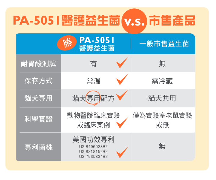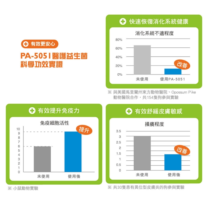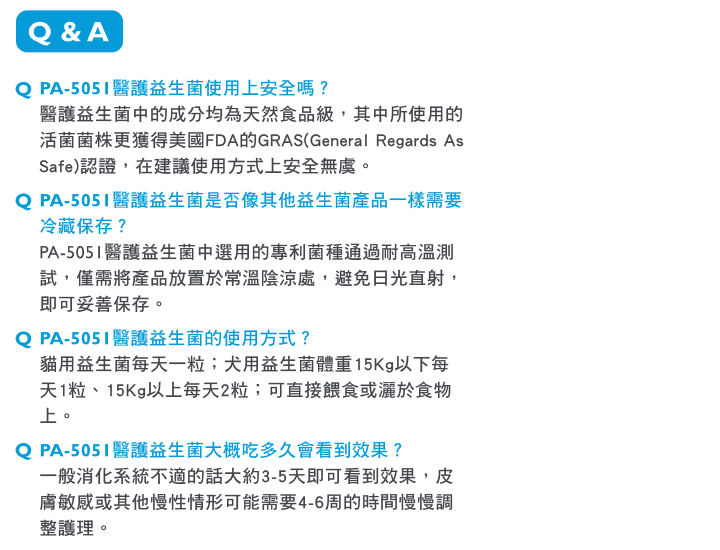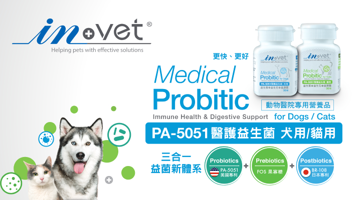 PA-5051醫護益生菌,以科學研究為基礎,專為毛孩們開發的益菌產品。率先使用三合一益菌系統,結合益生菌、益生質及益源質的益處,讓功能更加全面完整。能夠有效照護毛孩們的腸胃道機能、維持免疫能力、並管理皮膚敏感。對於腸胃皮膚敏感、以及正在進行療程的毛孩們,有著極佳的健康護理效果。