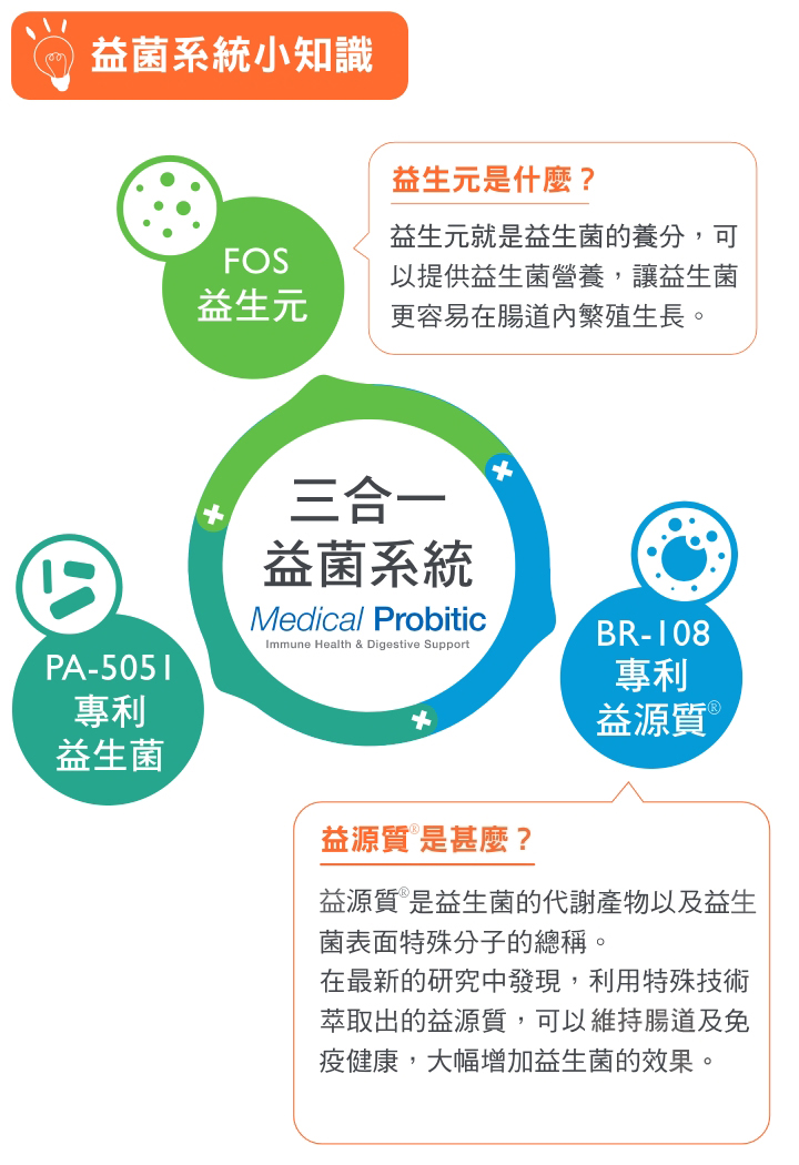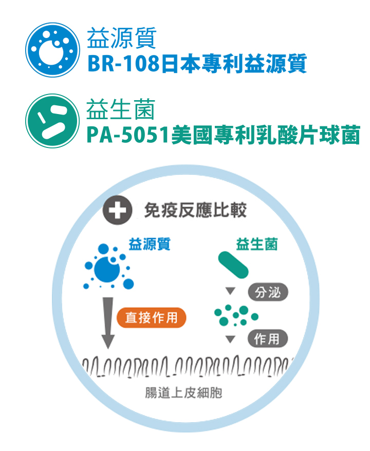專利乳酸片球菌PA-5051、牛磺酸、熱封分散型BR-108龍根菌(益源質)、果寡糖、酵母萃取物、明膠