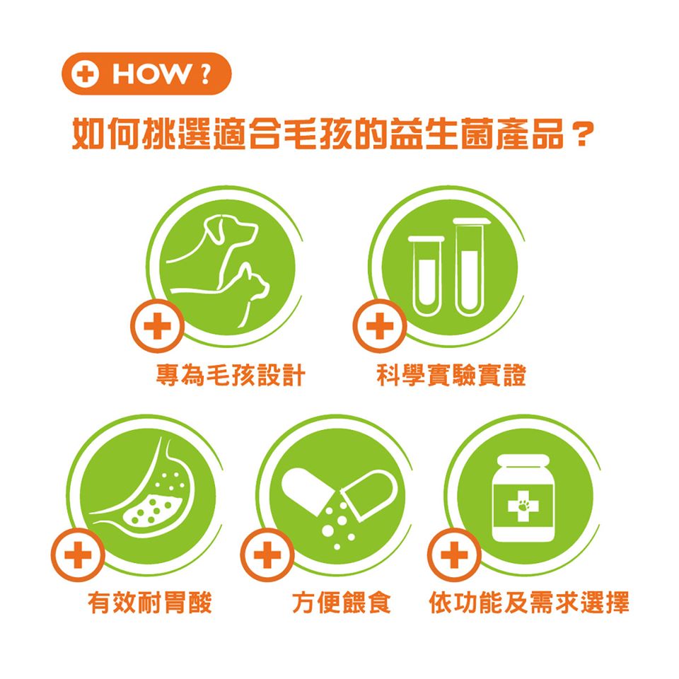 毛孩們身體不適,每個毛爸毛媽想必都心急又不捨。當毛孩健康出現狀況,除了一定要盡快尋求專業醫療協助,也可以在獸醫師的建議下讓毛孩們補充益生菌,維護毛孩的腸道機能及免疫力。
