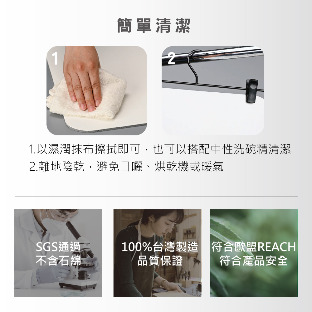 ● 一般清潔以濕潤抹布擦拭即可,也可以搭配中性洗碗精清潔,最後再仔細清除洗碗精殘留。