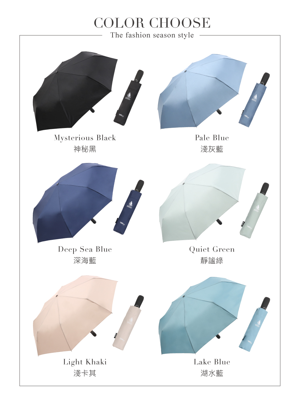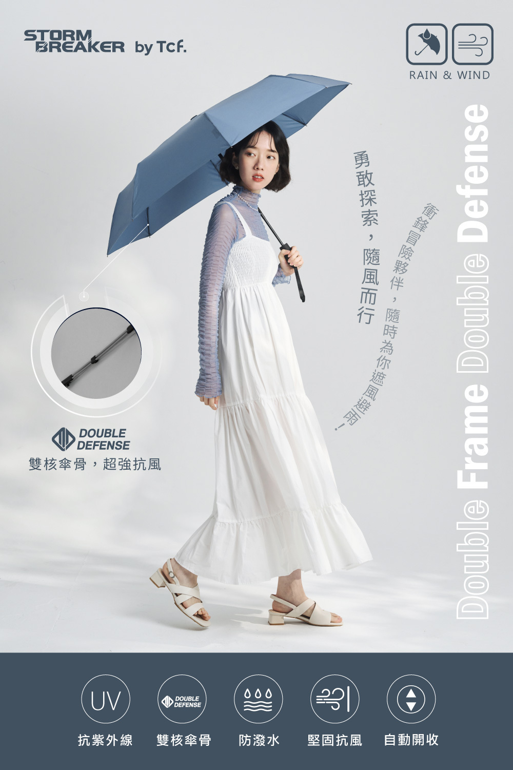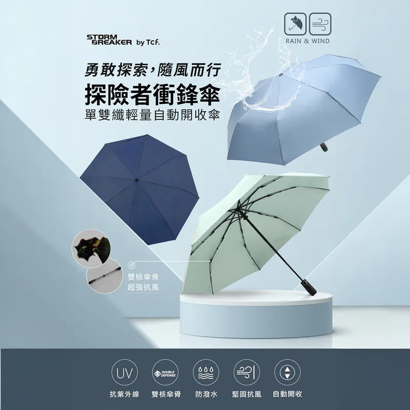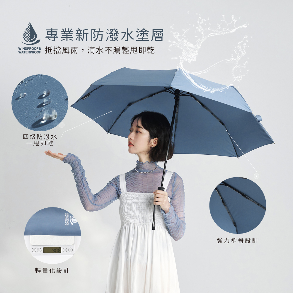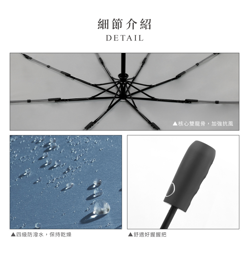 ‧雙核心強化,增強支撐力‧四級防潑水傘布,一甩即乾‧一鍵自動開收,單手操作方便